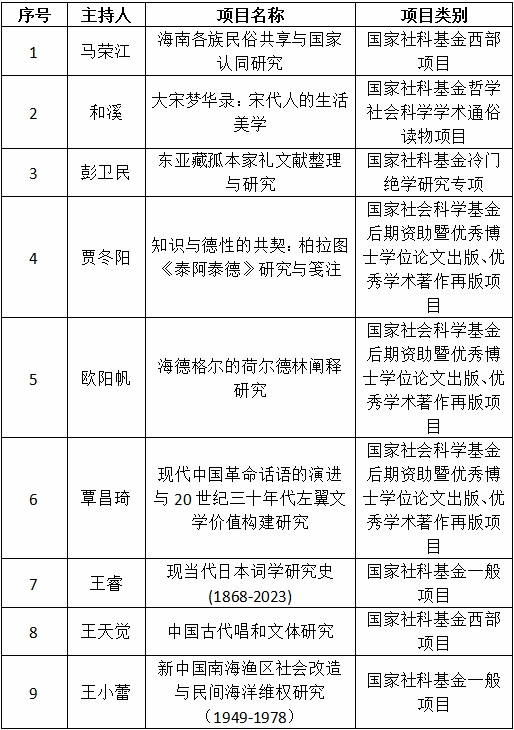 近期,2024年度国家社会科学基金哲学社会科学学术通俗读物项目、2024年国家社科基金冷门绝学研究专项、2024年国家社会科学基金年度项目、2024年国家社会科学基金后期资助暨优秀博士学位论文出版、优秀学术著作再版项目立项名单相继公布,英雄联盟下注网站 携手海南省东坡文化研究与传播中心共获批9项课题,具体情况如下: