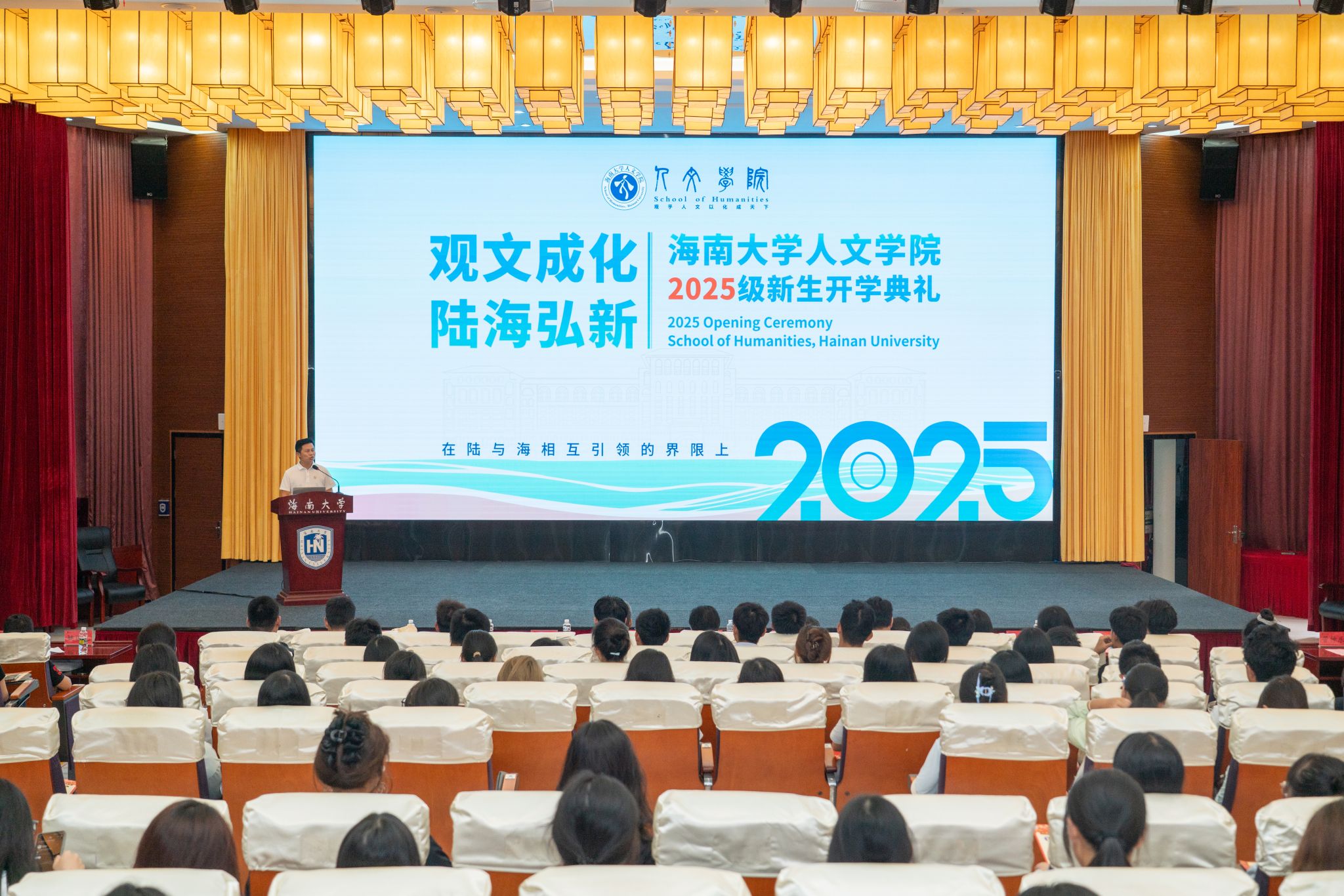 ,在这里开启自己的大学篇章。谭新红以“学慎始习”为题, 为初入人文殿堂的新生们作了一场深邃而富含历史使命感的讲话。他以钱穆先生的慨叹切入,直面当代社会对人文价值的质疑,深刻揭示了人文教育的根本使命——在古今中西的激荡中,不仅需要思考“我们是谁”,还需要重新追问“何为中国”,以此回应时代对文明复兴的呼唤。他希望大家谨记《文心雕龙》“学慎始习”之训,以审慎之心奠基,以经典铸根底,以笃行择思想,如此方能以更深邃的目光、更自信的心态、更开放的襟怀真正跨入人文之门,为时代和世界承担责任,为中华民族伟大复兴贡献海大人文力量。