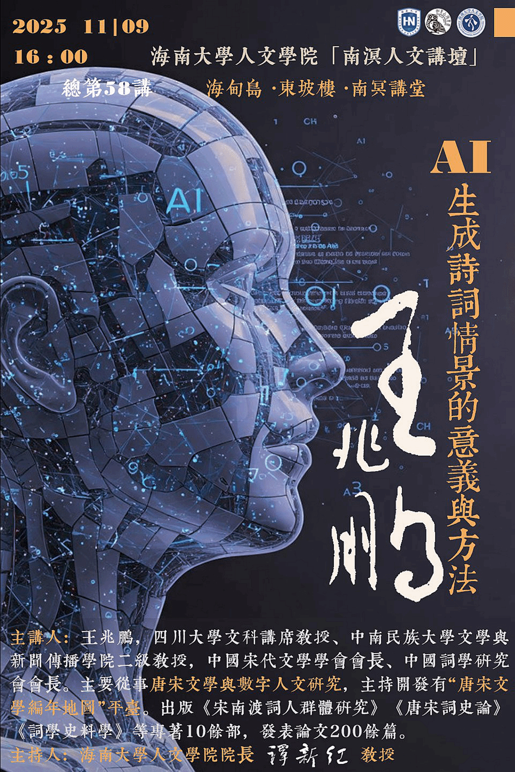 “南溟人文讲坛”第58讲,作了题为《AI生成诗词情景的意义与方法》的学术讲座。讲座由谭新红院长主持。我校师生70余人聆听了本次讲座。