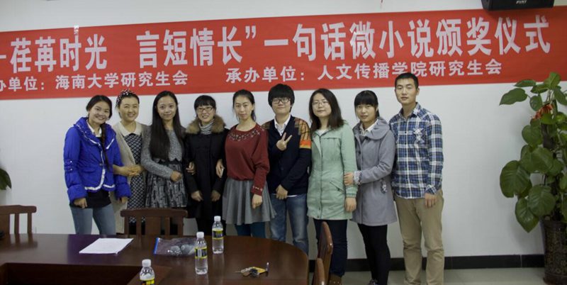 2014年12月24日下午,由海南大学研究生会主办、人文传播学院研究生会承办的“正青春—荏苒时光,言短情长”一句话微小说征文大赛颁奖仪式在社科楼B719会议室举行。出席此次颁奖仪式的嘉宾有人文传播学院石晓岩副院长、校研会主席于赫、人文传播学院荣誉主席王天巍。与会嘉宾还有各学院的研会代表以及征文大赛的25位获奖者。颁奖仪式由院研会办主任杨烁主持。 会上,石副院长首先代表人文传播学院全体导师和在校研究生感谢全校研究生对本次活动的积极参与,并表示很高兴为各院研究生搭建一个展示研究生文学才华的平台,以拉近各学院文学爱好者们的距离。石副院长对本次一句话微小说作品征集活动的立意与创新之处、给予充分的肯定,指出:此次活动 “以‘青春’、‘时光’、‘情感’为主题十分到位,旨在将青葱岁月中给予自己正能量的人、遇到的那些暖人心的事诉诸笔端。随后,人文传播学院研究生会主席孙凌昱做了总结发言,她对本次活动的征集和评审情况做了全面细致的汇报,对校研究生工作部的正确指导、学院的全面支持以及校研究生会的鼎力帮助致以诚挚的谢意。最后,于赫与王天巍宣读了此次获奖名单,并为获奖选手颁发荣誉证书。 据悉,此次 “正青春—荏苒时光,言短情长”一句话微小说活动收到了来自14个学院在校研究生的微小说作品,共计172则,经过人文传播学院研究生会初审、各学院研究生会复审以及人文传播学院专业老师的终审,以匿名方式评选出了25则获奖作品,其中最动人作品奖3名,最创新作品奖3名,最精炼作品奖3名,优秀作品奖16名。 此次微小说作品征集活动彰显了同学们的文学热情,畅快抒写了青春的所思所想,弘扬了文学魅力。本次颁奖仪式在嘉宾与获奖选手合影留念的轻松温馨的氛围下圆满落幕。(文:张媛,彭露 图:周含 审议:杨佩佩)