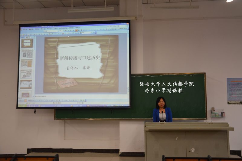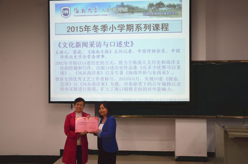 12、13级戏影专业的学生及专业爱好者。石晓岩副院长为蔡葩老师颁发“海南大学2015冬季小学期授课外聘专家”证书。 同学们对蔡葩老师的到来表示热烈欢迎,大家通过鞠斐老师的介绍了解到,蔡葩老师的历史随笔集《有多少优雅可以重现》、《找回南洋》。《国医出自海南岛》获第十三届海南省新闻评奖副刊一等奖,《格格遗事》获第十四届海南省新闻评奖副刊二等奖。 随后课堂上,蔡葩老师以诙谐幽默的讲课方式教授学生们在《口述历史》方面的知识。蔡葩老师曾在2002年采访过海口名媛吴玉琴、前清格格爱新觉罗?恒容、海岛留守女人等不下百名见证了海南历史兴衰的人物,尽管采访对象都是老人,但蔡葩老师有能力让他们对她掏心掏肺。本次授课以新闻采访专题片播放的形式娓娓道来。看似漫长的4节课,即将结束,总结本次课程蔡葩老师以3个篇章向学生详细介绍了她在口述历史时采访过程中的细节,万事开头难,蔡葩老师以自己独有的亲和力成为采访对象家庭中的一员;也包含着她对这些老人们经历的感慨和体悟。最后半个小时,蔡葩老师与同学互动答疑,lol下注
