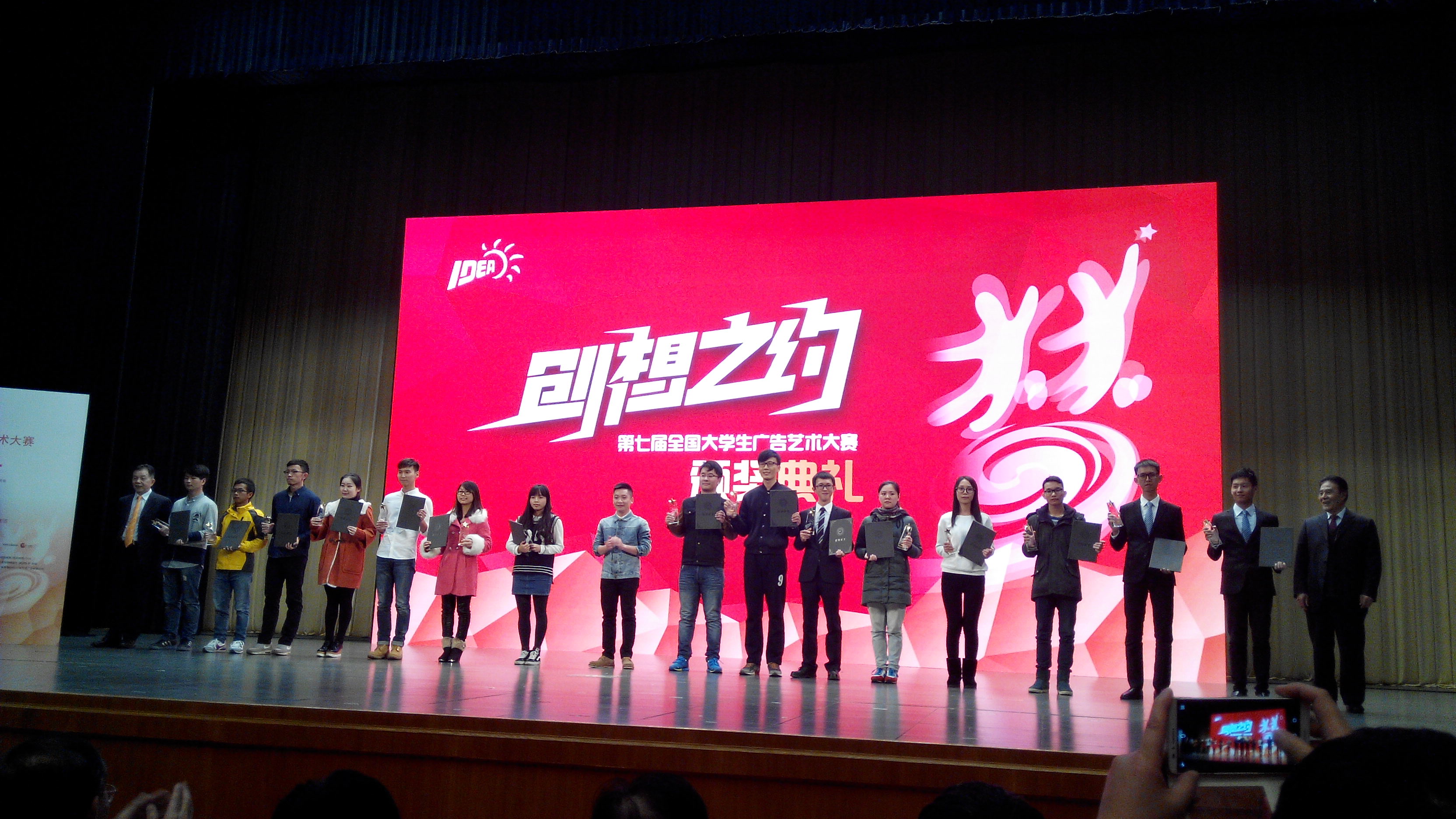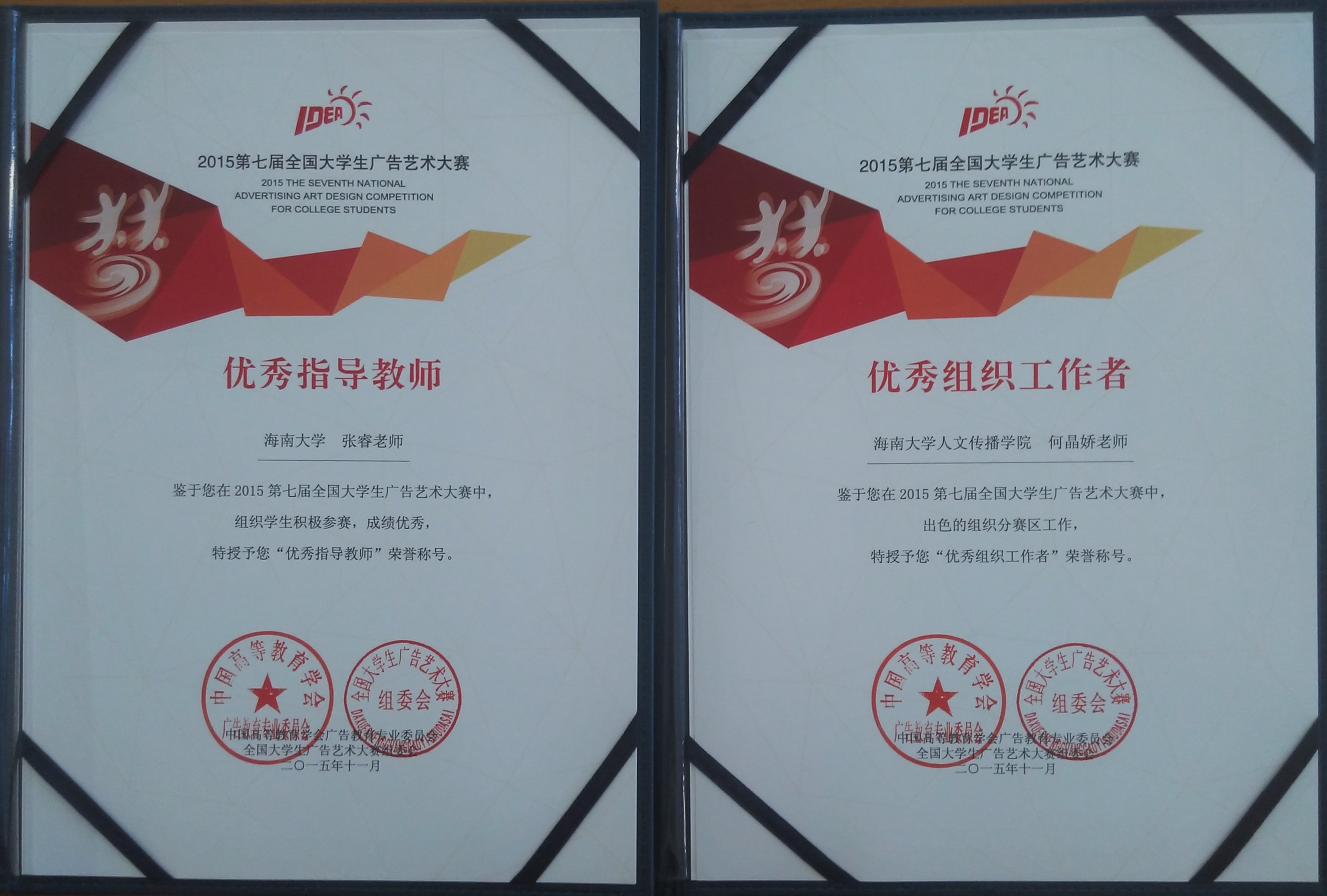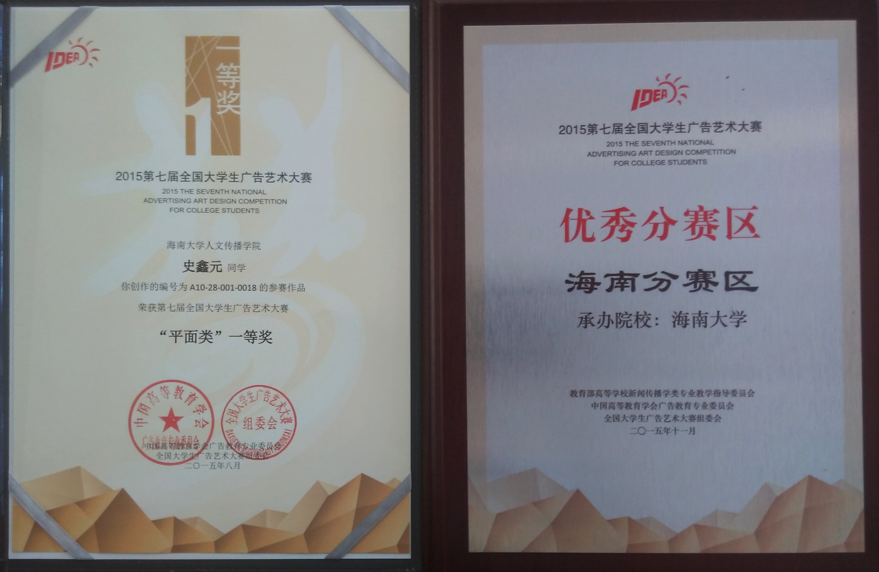 2015年11月21日,第七届全国大学生广告艺术大赛颁奖典礼在全国政协礼堂隆重举办,全国千名嘉宾代表、获奖师生齐聚北京,共襄盛举。出席颁奖典礼的有:教育部相关领导、主办单位的领导、参赛高校的领导、大广赛组委会委员、评委代表、分赛区负责人、多家媒体和900多位获奖师生代表。颁奖典礼由北京电视台马迟、河南省电视台许珍妮主持。 全国大学生广告艺术大赛是由教育部高等教育司指导,教育部高等学校新闻传播学类专业教学指导委员会、中国高等教育学会广告教育专业委员会主办的全国高校文科大赛。主题口号为“创意我追梦”的第七届大广赛覆盖全国28个分赛区31个省、自治区、直辖市。2015年,历经十年发展的大广赛首次设立海南分赛区,海南大学作为海南赛区的承办单位,积极组织,广泛动员,顺利完成海南赛区作品评审工作并报送优秀作品至全国总赛区。经学界、业界先后两个阶段的全国总评审后,海南大学人文传播学院广告系2013级学生史鑫元创作《露脸见人》平面广告获得全国一等奖,人文传播学院张睿老师获得优秀指导老师奖、何晶娇老师获得海南赛区优秀组织工作者奖,海南赛区另斩获优秀奖16项。鉴于海南赛区的优秀成绩,大广赛组委会特授予海南赛区为优秀分赛区,海南省教育厅为优秀指导单位。 青春,需要磨炼,更需要赛事的洗刷与再造。全国大学生广告艺术大赛给了莘莘学子们在追逐梦想的征程中跋涉的勇气和证明创意才华的机会,为广告教育提供了实践教学的最佳平台。第八届全国大学生广告艺术大赛在颁奖礼现场启动,海南大学将一如既往办好大广赛,海南大学人文传播学院将再接再厉,结合实践教学,再创佳绩。