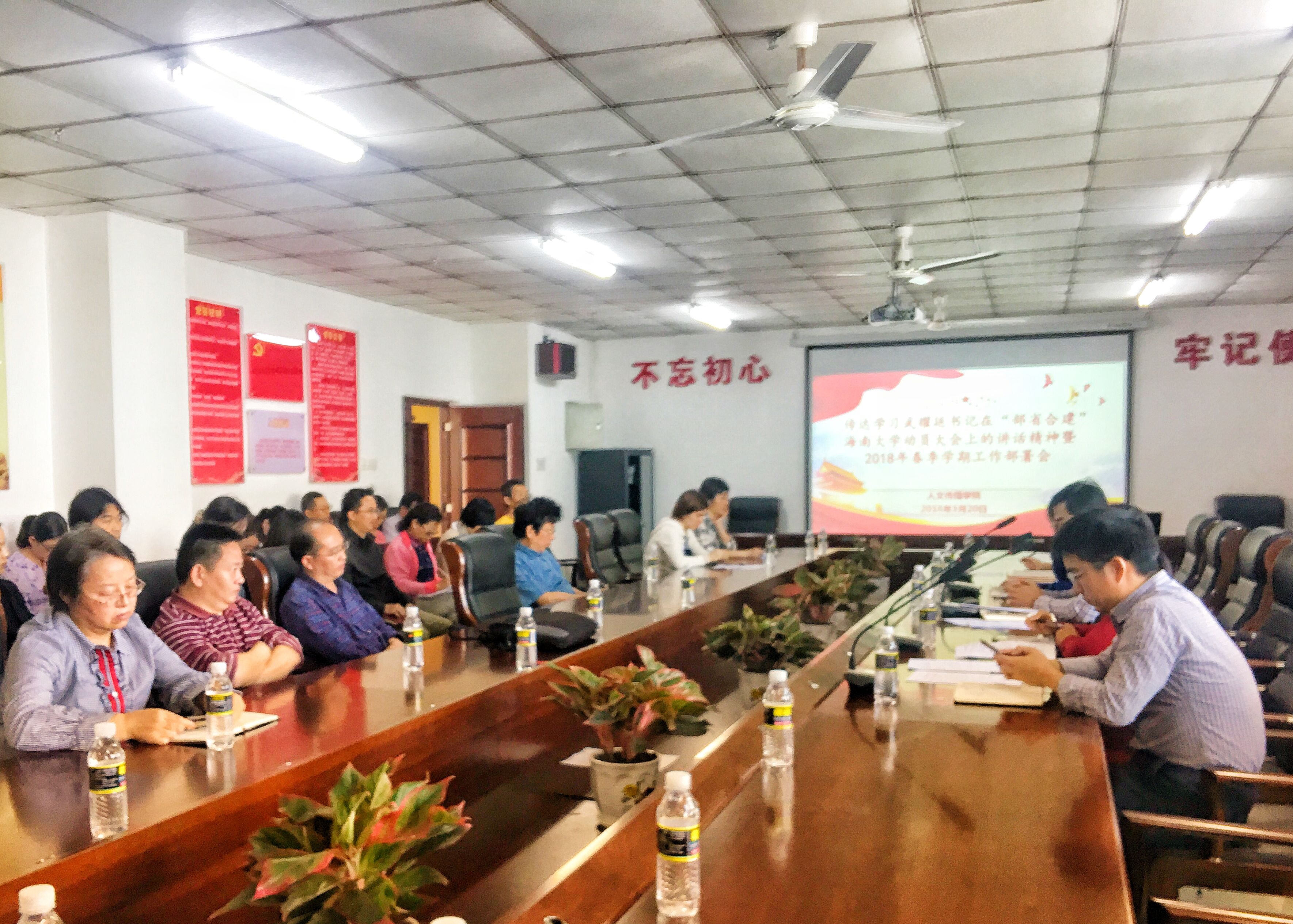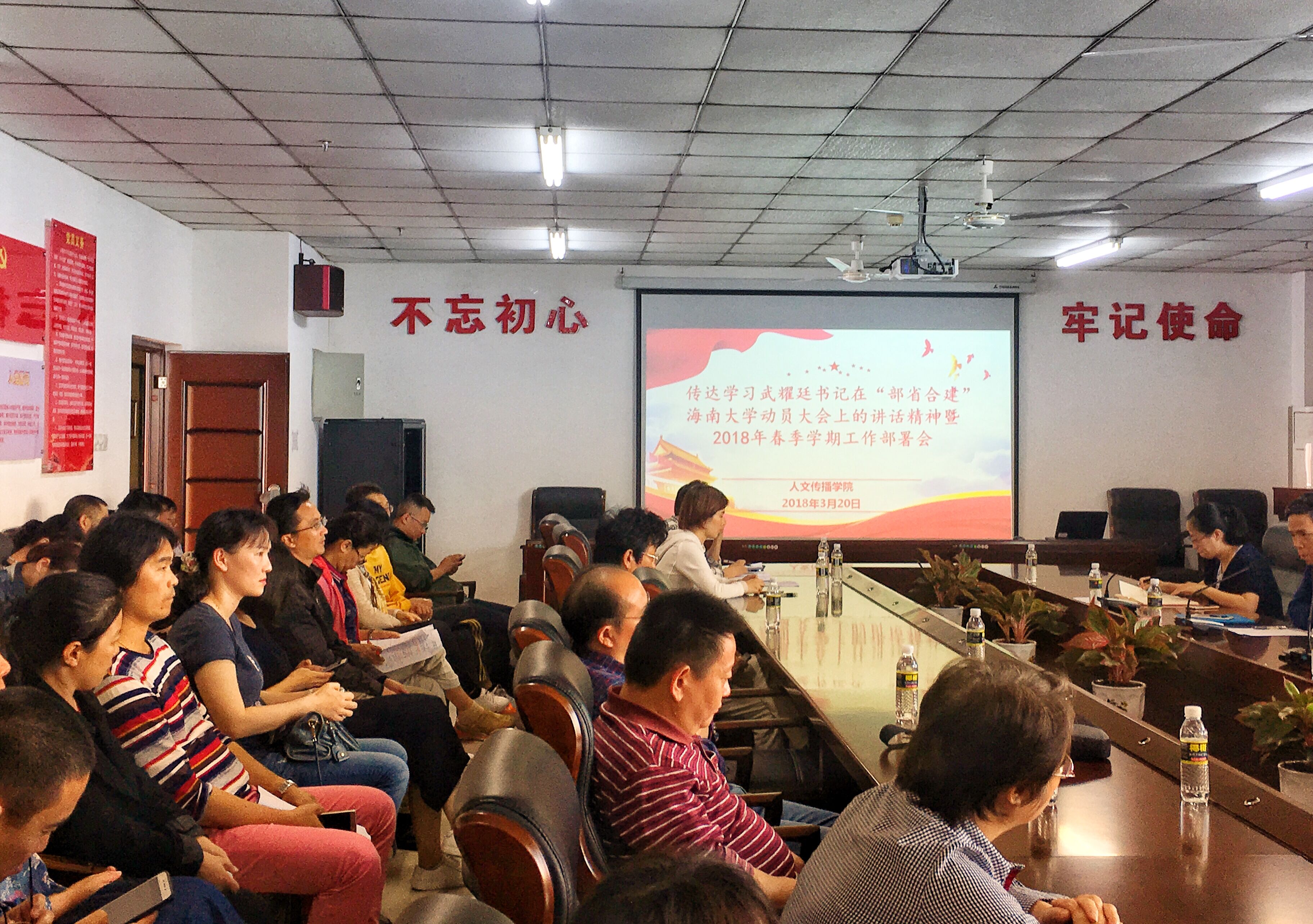 2018年3月20日下午,人文传播学院在社科楼B719会议室召开新学期第一次全体教工大会,传达学习武耀廷书记在“部省合建”海南大学动员大会上讲话精神,并部署安排学院新学期工作。大会由刘复生院长主持,院党委书记华世佳、副书记孙晓媛、副院长石晓岩、张硕果以及70余名教职员工参加了会议。