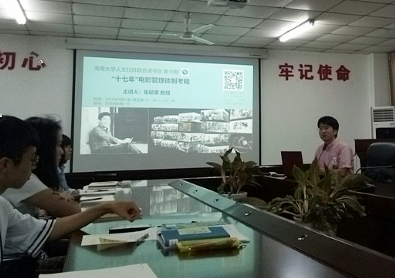9月21日晚,海南大学人文社科联合读书会第10期——由张硕果教授主讲的“十七年”电影管理体制考略在社科楼B719顺利举行。 本次读书会由李音老师主持,张硕果老师主讲。分别从制片、发行、放映三个视野,依次梳理了“十七年”电影管理体制的发展演变情况。此次讲座不仅丰富了与会师生的知识,开拓了学术研究的视野,更在史料研究方法上带来极大启发。 讲座之后与会老师纷纷做出精彩点评,同学们也积极参与讨论提问。同学们纷纷表示通过这次讲座学到了许多课本上查阅不到的知识,亦有同学庆幸借此机会纠正了自己的知识误区。大家希望今后能通过读书会跟老师进行学术上的沟通交流,取得学术上的长足进步。