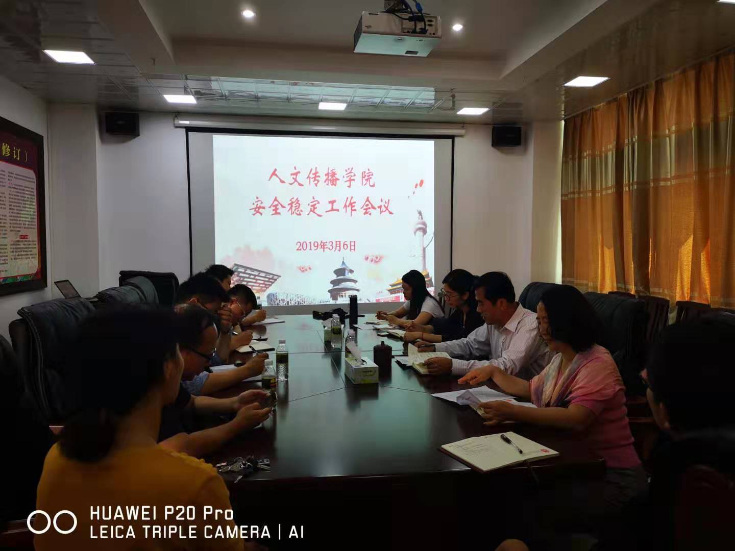 2019年3月6日上午,人文传播学院安全稳定工作会议在社科楼B615会议室召开。会议由学院党委书记华世佳主持,学院党委副书记孙晓媛、党委委员王春嵩、实验室负责人、综合办工作人员以及全体辅导员参加会议。