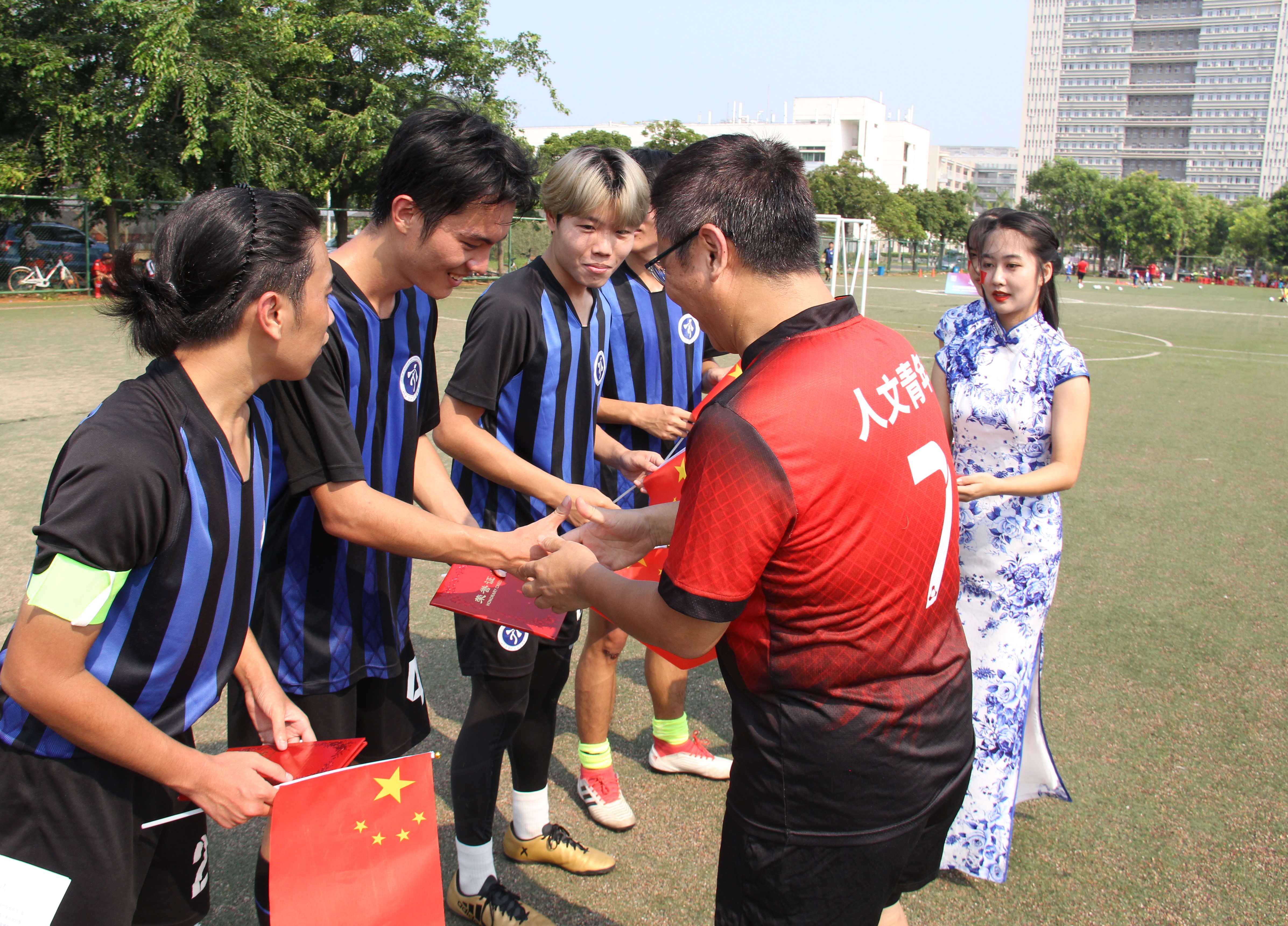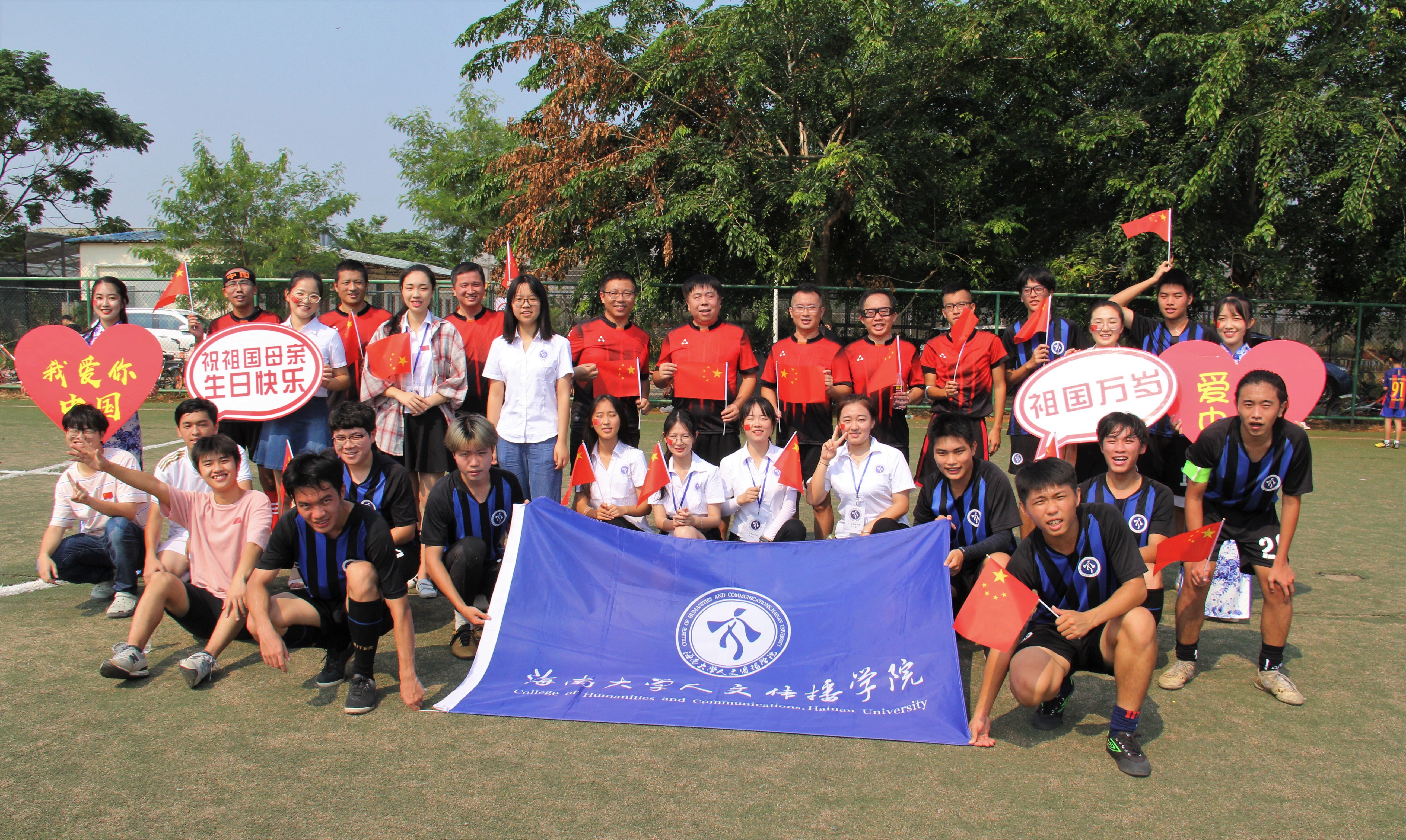 海南大学人文传播学院喜迎中华人民共和国成立七十周年师生足球友谊赛,于9月28日8时30分在海南大学第二田径运动场顺利举行。此次比赛得到师生广泛参与,反响热烈。本次比赛教师队伍参赛教师有王春嵩、乔焕江、李安斌、颜 磊、朱杰、翁浩予、梁雷雨、林佳;学生队伍参赛球员有刘宏、颜业胜、符诗宝、金相宇、周炜杰、付鑫、李佳、林高志、钱贤国、马昱含、王昊、徐鑫隆,由海南大学足球协会张孝睿、杨松卫担任裁判。