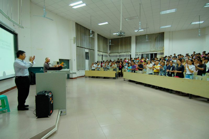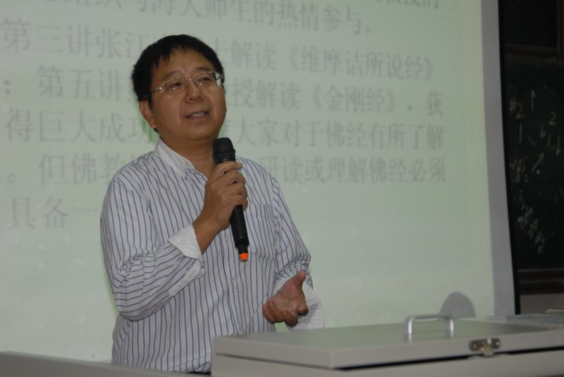 2012年10月28日晚八点,东方经典系列讲座第七讲如约开讲,本讲盛情邀请到华中师范大学文学院古典文献学博士生导师、《华中学术》主编张三夕教授担任主讲,讲解大乘佛学另一部重要经典《楞严经》。《古典与现代》主编杨国良教授主持本场讲座。 在主持开场中,杨国良教授向听众详细介绍了张三夕教授的学术背景,并围绕张三夕教授重视学术承传的特点,重点介绍了张教授在带硕士生和博士生时所制定的“张门门训”。张三夕教授学术积淀深厚,学识渊博,曾先后受业于我国著名古代文史学家程千帆先生和文献学大师张舜辉先生门下,秉承业师大家风范,重视学术精神的承传。 “敬业乐群、守时守信、博而能一、厚积多发……”在现场听众两次齐诵中,“张门门训”见证着薪火相传的学术承继传统,也见证着张三夕教授敬业乐群,诲人不倦的师者风范。在开场中,张三夕教授也表达了对杨国良教授的谢意,感谢人文传播学院与《古典与现代》的盛情邀请,使得有机会回到原先工作过的海南大学,与老朋友叙旧和做学术交流。 本场讲座张三夕教授以“定力与空性”为题展开对《楞严经》大义的解读。联系东方经典系列讲座第三讲张江南博士解读《维摩诘所说经》,第五讲熊开发教授解读《金刚经》,张三夕教授认为对于博大精深的佛学,研读和理解佛经应具备以下准备性的知识与经验做基础:一、对印度的历史文化、地理、风俗、语言等有一定的了解;二、要了解佛教的创始人释迦牟尼,能记清释迦牟尼的多个称谓和其十大弟子的名字;三、要能对佛家的基本教义和关键词有精到的把握和理解,如《楞严经》中所涉及的“六尘”、“六根”、“六入与六出”、“十八界”等;四、要了解佛教的分层与分期;五、本人应有一定的修行经验,特别是一种“内明”的体验;六、要明确佛经讲解释义中的风险,讲解佛经需要极高的佛学修养和内明实证功夫。 在一段专业性的指导之后,张三夕教授围绕《楞严经》的经名、因缘、历史地位及其价值展开讲解。《楞严经》全名《大佛顶如来密因修证了义诸菩萨万行首楞严经》,经名释义丰富。《楞严经》的传入和译介则有着传奇的经历,据载唐中宗神龙元年(705年),中印度僧人般剌密帝用极细的白毷(毛)写出《楞严经》,用蜡封妥,割开臂膀,潜藏皮下,传到中国。传说经四人之力,由当时宰相房融笔受润色,得以翻译面世。《楞严经》在佛经中是正法的代表,被誉为佛法的眼睛,经文集中反映了佛法的宇宙观、人生观、价值观,全面道出了佛法的本体论、认识论、实践论等诸问题,世人曾有“自从一读《楞严》后,不看人间糟粕书”之说。 在接下来围绕《楞严经》大义的解说中,张三夕教授首先指出《楞严经》的宗旨大纲和核心命题是:“信佛者面对无时无刻不在变化的 ‘尘根’,如何离尘脱根,直指人心,修炼坚固的楞严大定,从肉身中发现不生不灭的空性。”全经解行并重:前四卷是“解”,是经文的重点和主体部分;后六卷是“行”或“证”(修行或修证)。接着张三夕教授重点围绕第一二卷的主体内容:“七处征心”、“十番显见”展开讲解,在其看来“七处征心”重点辨析一个心性本体论问题:心在何处?而“十番显见”则是在辨析一个心物认识论问题:何为见性?如果说“七处征心”是破妄,那么“十番显见”则是显真。在对“十番显见”的讲解中,张三夕教授以机智的佛学比喻使听众体悟到显见即“见性”,我们自性即“空性”中“能见的功能”不依赖眼睛和任何物质条件而独立存在,是永恒不息的生命之流。如何从肉身中发现不生不灭的空性是《楞严经》的核心问题。在张三夕教授看来,“十番显见”有多方面的现代启示意义:一、空性向每个个体承诺绝对自由,绝对自由转为永恒的生命理念。二、领悟空性并不意味着拒绝俗世事务。三、见性不因对象变化而变化,能见就是一种根性。四、人性是空性在生命体中的显现,人性同时也是空性的遮蔽。五、在感知“空性”中,世俗人生也需要定力、空性的修证。六、通过楞严大定的修炼而透彻领悟空性,将空性的领悟转化为日常的道德自律,值得去思考,也不失为当下中国人丧失道德底线(即丧失定力)的解决方案之一种。七、阅读《楞严经》,要领略语言的精准、美妙,值得涵泳和学习。 讲座的最后张三夕教授借用南怀瑾先生《楞严大义序》中的一段话祝福现场听众:悟得真实智慧解脱的真理,使这个颠倒梦幻似的人生世界,能升华到恬静安乐的真善美之领域。张三夕教授的博学宏富和充满激情的精妙讲解获得了全场听众起立长时间雷鸣般的掌声。在互动环节,张三夕教授还热情的回应解答了听众提出的各类问题。