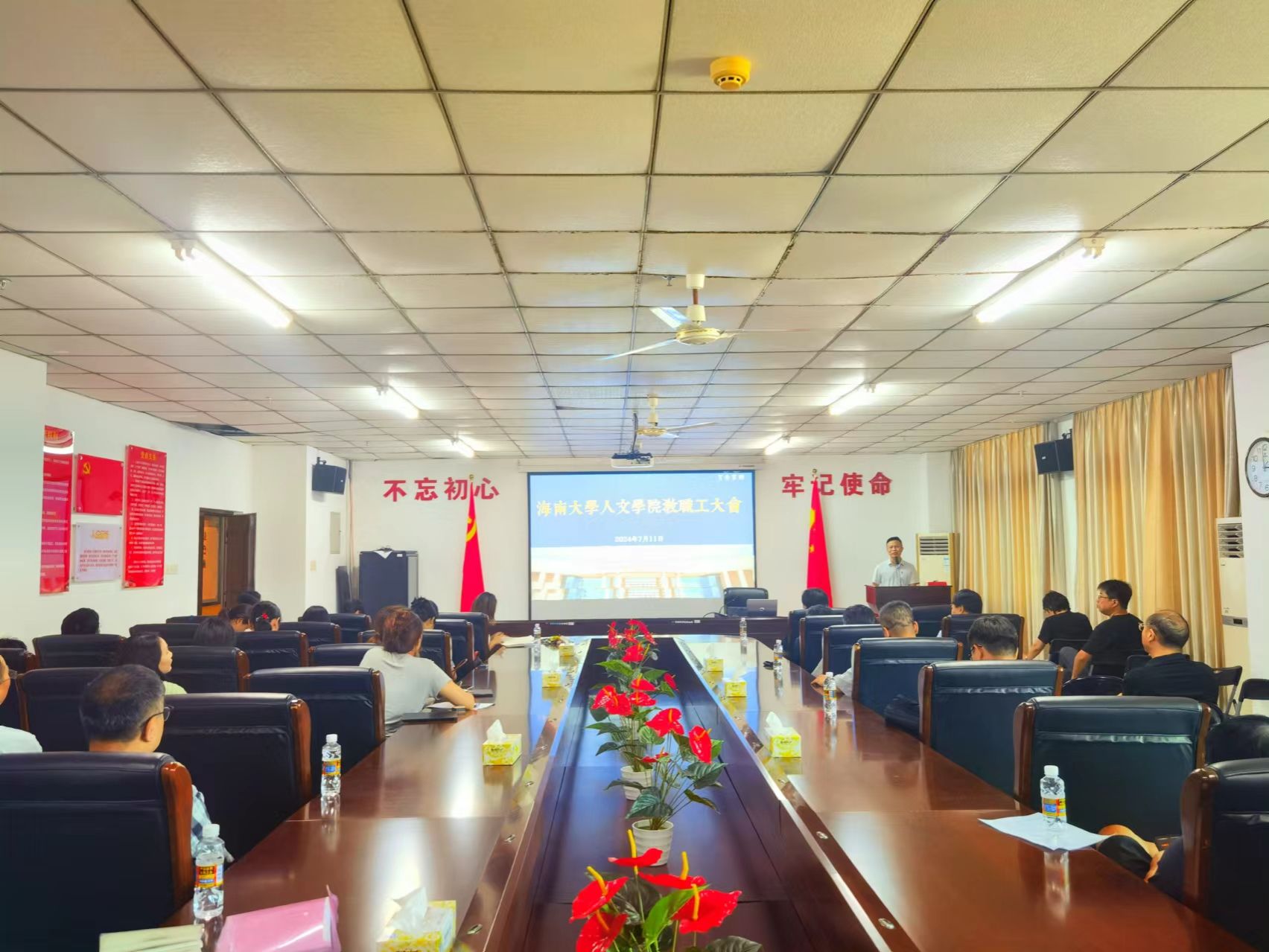 在社科楼B719会议室召开全体教职工大会。学院领导班子成员和全体教职工参加会议。