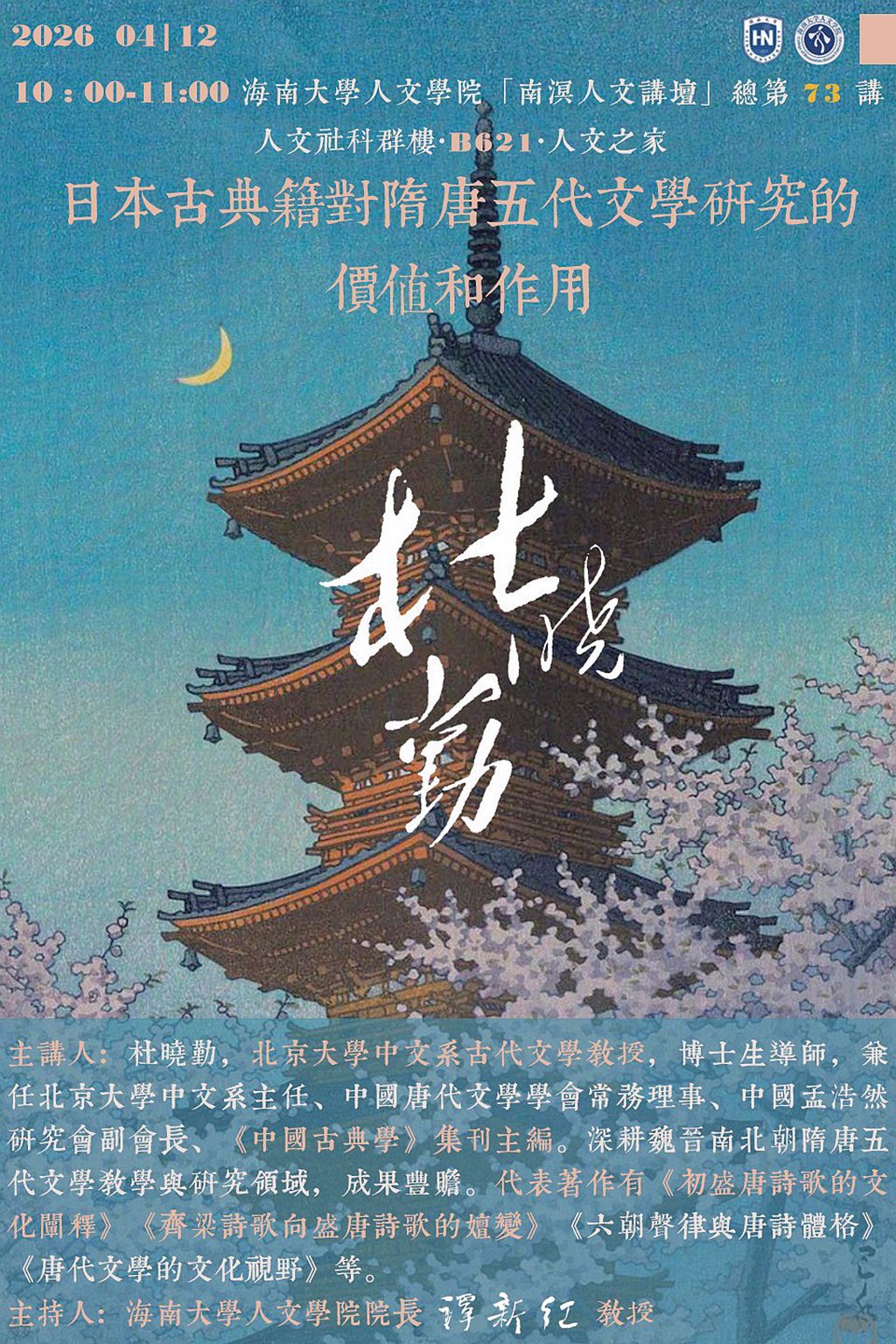 【学术预告】英雄联盟下注网站 “南溟人文讲坛”第73讲 杜晓勤:日本古典籍对隋唐五代文学研究的价值和作用