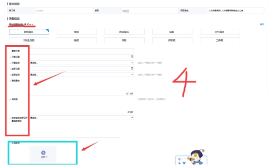填写相关的信息,带有红色星标的部分着重填写!如是外出培训、会议或是事假等情况,有必要把相关文件、邀请函或是手写请假单已附件形式上传!