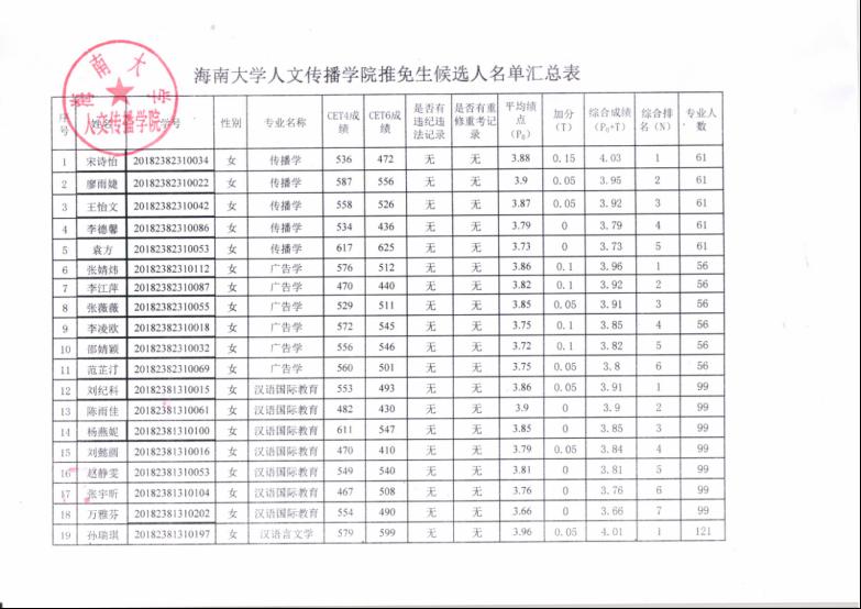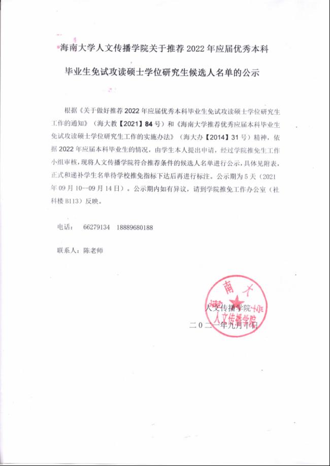 海南大学人文传播学院关于推荐2022年应届优秀本科毕业生免试攻读硕士学位研究生候选人名单的公示
