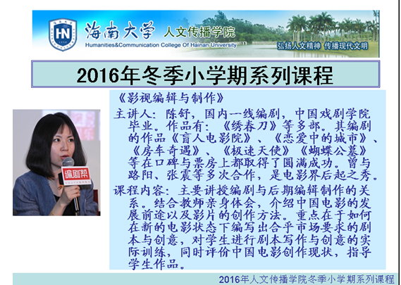 13、14级戏剧影视文学专业的学生们讲授冬季小学期系列课程。在本次的冬季小学期中,陈舒老师为大家开设的课程为《影视编辑与制作》。主要讲授编剧与后期剪辑制作的关系,结合自身经验,介绍中国电影的发展前途以及影片的创作方法。