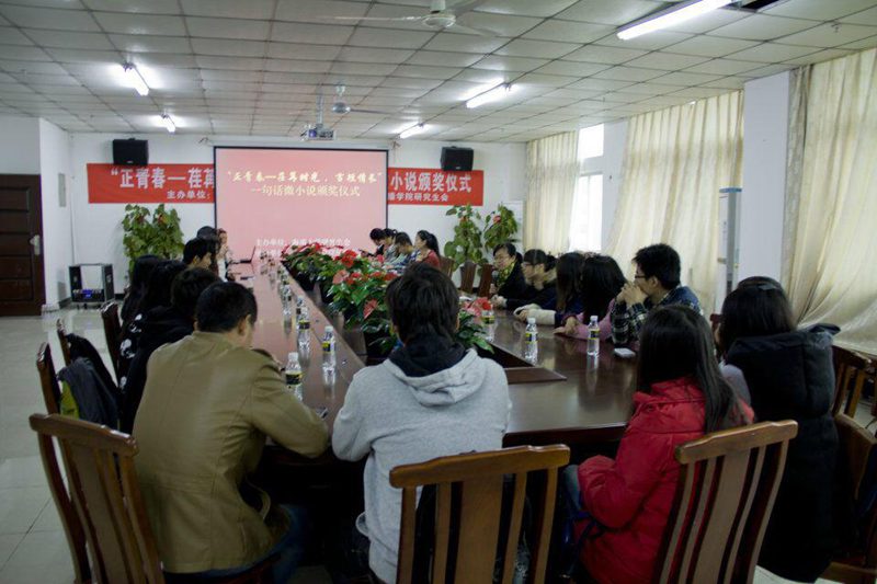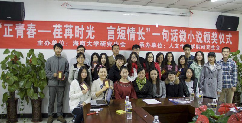 2014年12月24日下午,由海南大学研究生会主办、人文传播学院研究生会承办的“正青春—荏苒时光,言短情长”一句话微小说征文大赛颁奖仪式在社科楼B719会议室举行。出席此次颁奖仪式的嘉宾有人文传播学院石晓岩副院长、校研会主席于赫、人文传播学院荣誉主席王天巍。与会嘉宾还有各学院的研会代表以及征文大赛的25位获奖者。颁奖仪式由院研会办主任杨烁主持。 会上,石副院长首先代表人文传播学院全体导师和在校研究生感谢全校研究生对本次活动的积极参与,并表示很高兴为各院研究生搭建一个展示研究生文学才华的平台,以拉近各学院文学爱好者们的距离。石副院长对本次一句话微小说作品征集活动的立意与创新之处、给予充分的肯定,指出:此次活动 “以‘青春’、‘时光’、‘情感’为主题十分到位,旨在将青葱岁月中给予自己正能量的人、遇到的那些暖人心的事诉诸笔端。随后,人文传播学院研究生会主席孙凌昱做了总结发言,她对本次活动的征集和评审情况做了全面细致的汇报,对校研究生工作部的正确指导、学院的全面支持以及校研究生会的鼎力帮助致以诚挚的谢意。最后,于赫与王天巍宣读了此次获奖名单,并为获奖选手颁发荣誉证书。 据悉,此次 “正青春—荏苒时光,言短情长”一句话微小说活动收到了来自14个学院在校研究生的微小说作品,共计172则,经过人文传播学院研究生会初审、各学院研究生会复审以及人文传播学院专业老师的终审,以匿名方式评选出了25则获奖作品,其中最动人作品奖3名,最创新作品奖3名,最精炼作品奖3名,优秀作品奖16名。 此次微小说作品征集活动彰显了同学们的文学热情,畅快抒写了青春的所思所想,弘扬了文学魅力。本次颁奖仪式在嘉宾与获奖选手合影留念的轻松温馨的氛围下圆满落幕。(文:张媛,彭露 图:周含 审议:杨佩佩)