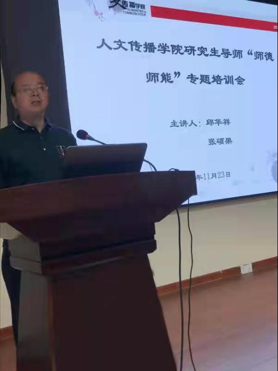 首先,由海南大学人文传播学院党委书记邱华祥向全体到会人员进行“师德”培训。主要内容包括深入学习习近平总书记关于师德师风的重要论述、强化教职工“四史”学习教育、开展师德优秀典型先进事迹宣传学习、引导教师学习践行新时代师德规范、集中开展师德警示教育、开展师德典型及工作案例评选表彰活动六个方面。