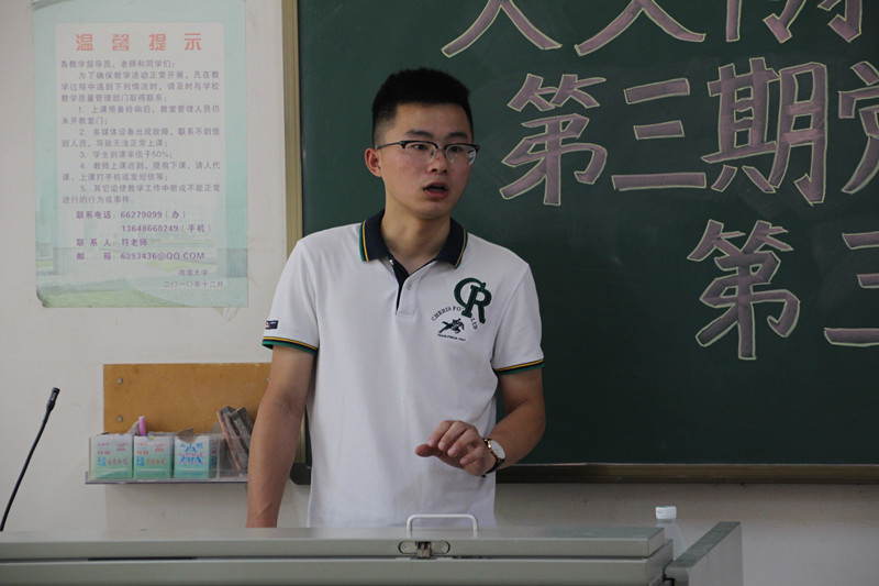 为端正广大党员思想,促进广大学员以实际行动成为一名合格党员,2017年4月11日下午3点整,人文传播学院分党校第三期党课第三讲于海南大学海甸校区2教101教室顺利开展。此次党课围绕中国共产党党员的条件、义务及权利展开,学工办李润东老师担任主讲人。