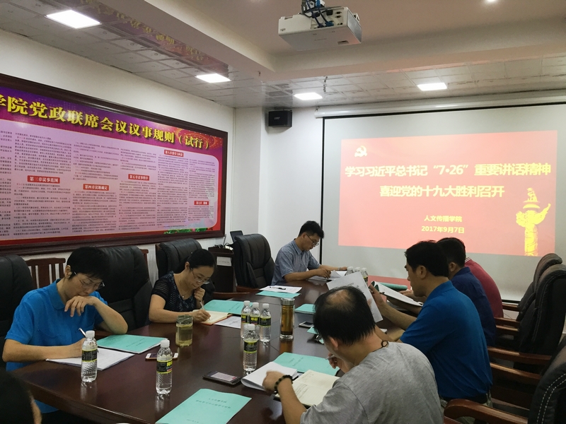 根据中共海南大学委员会办公室关于深入学习宣传贯彻习近平总书记“7·26”重要讲话精神的通知要求,9月7日下午,人文传播学院理论学习中心组在社科楼B615会议室,召开学习习近平总书记“7·26”重要讲话精神,喜迎党的十九大胜利召开专题会议。学院党委书记华世佳主持会议,院长刘复生、院党委副书记孙晓媛、副院长石晓岩、张硕果等理论学习中心组成员参加会议。