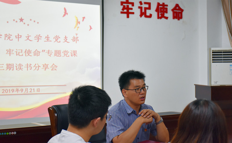 为促进党支部成员之间的学习交流,加强党性修养,人文传播学院中文学生党支部于9月21日晚,在社科楼B719举办“不忘初心、牢记使命”主题教育动员部署专题党课暨支部第三期读书分享会。党员部署专题党课暨读书分享会由支部书记熊文军主持,中文学生党支部全体党员参加。