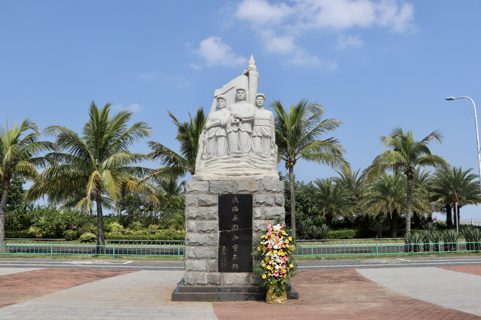 随后来到白沙门渡海作战纪念广场,献上花篮,全体人员默哀、鞠躬。