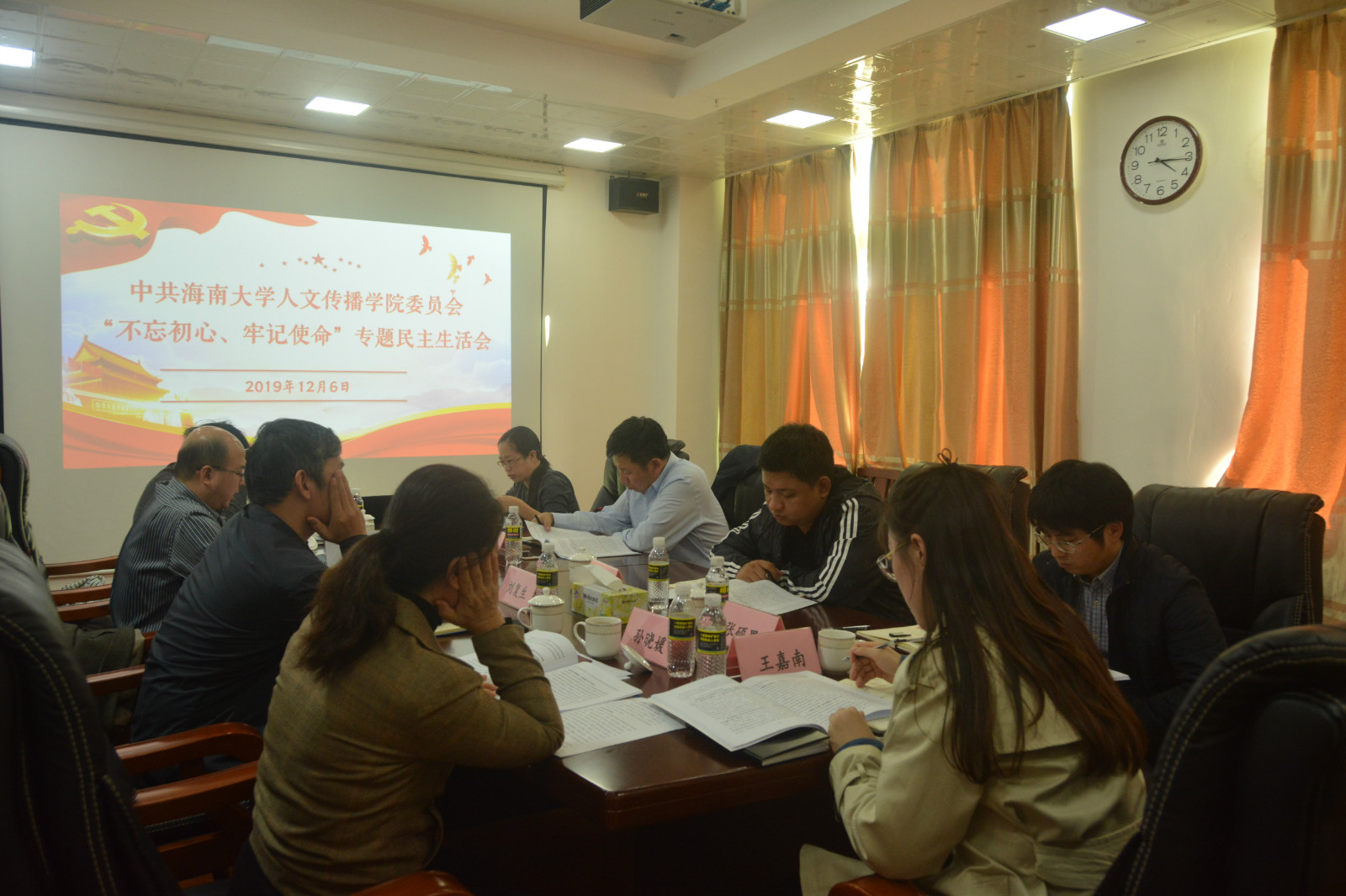 民主生活会的主题是:认真学习贯彻习近平新时代中国特色社会主义思想、习近平总书记关于教育的重要论述和关于海南工作的重要讲话和重要指示批示精神、党的十九届四中全会精神,增强“四个意识”、坚定“四个自信”、做到“两个维护”,全面贯彻落实党的十九大各项决策部署,巩固和运用好主题教育成果,牢记立德树人初心和使命,办人民满意的教育,努力创建世界一流学科和国内一流大学,积极推动中国语言文学一级学科博士点建设,服务国家战略和海南省自由贸易试验区和中国特色自由贸易港建设。