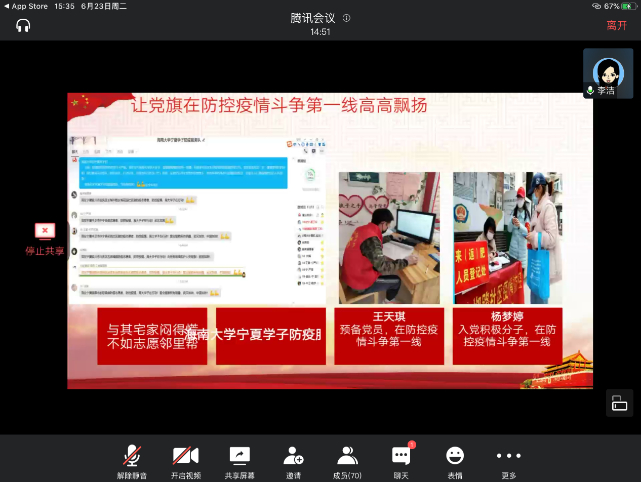 会议第一项是支部书记上微党课,党课主题是“让党旗在防控疫情斗争第一线高高飘扬”。支部书记李洁老师通过分享海南大学宁夏学子防疫服务队以及党员王天琪、入党积极分子杨梦婷等同学在疫情期间的抗疫表现,号召大家向身边的党员模范学习。李洁老师强调,每一个党员都是一面旗帜,每一个党支部都是一个堡垒。党的先进性,既要由党的整体来体现,也要由党员个体的表现来体现。越是在最危难的时候,越是需要榜样和引领。