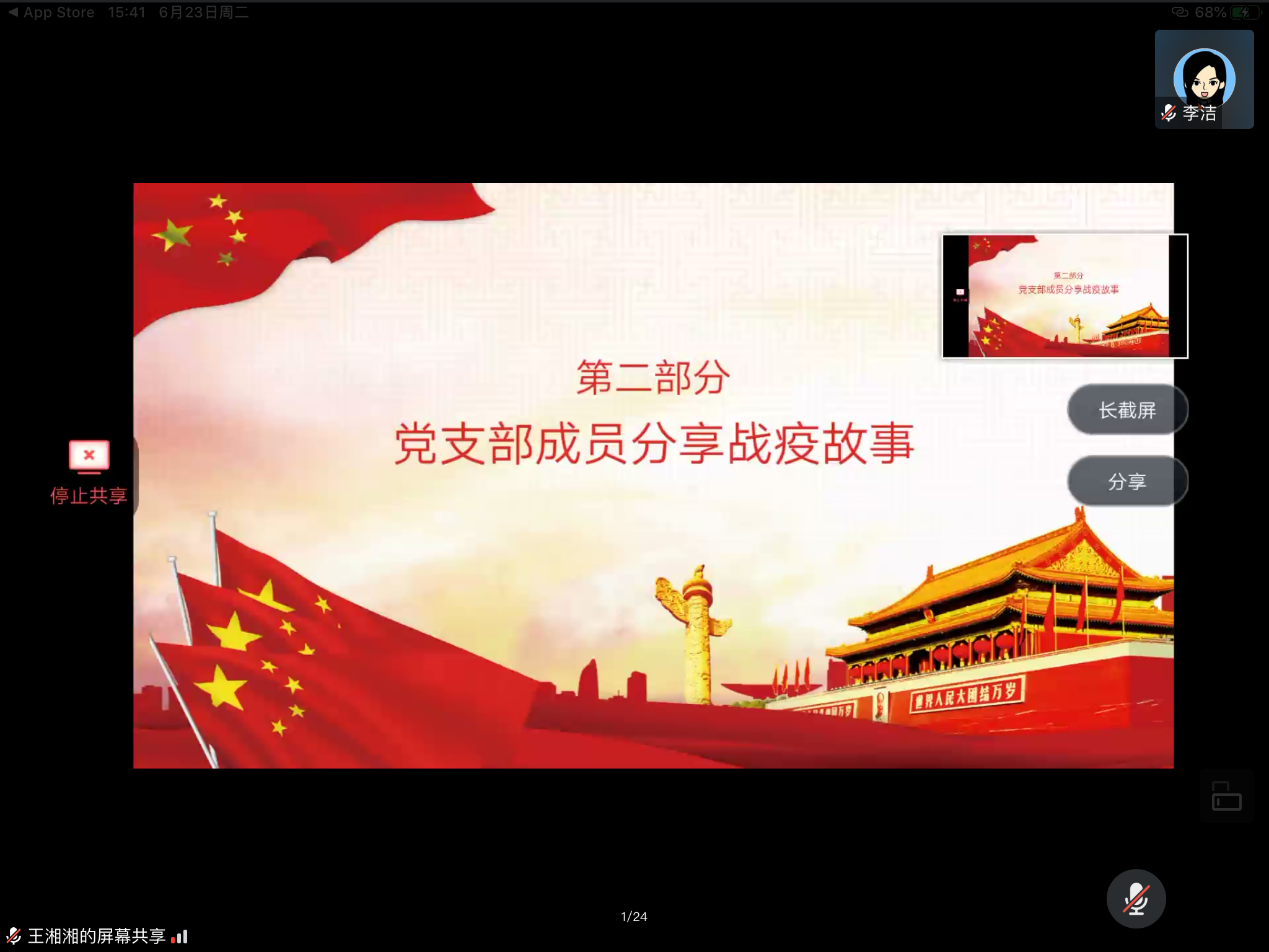会议第二项,由党支部的党员代表分享自己的战疫故事。马昱含同志在这次疫情中,结合自己的兴趣爱好---写作,写了一篇有关疫情的文章并投稿到人民网的征文活动当中,通过文字来为“战疫”力量发声、鼓劲;施雅馨同志首先分享了自己身边的华侨回国支援物资的战疫故事,她个人也深受启发,积极学习疫情相关的专业知识科普给身边的大人与小孩。张倩楠、方静妍、王洁、陈昱晗等同志也分享自己身边的战疫故事和个人感悟。