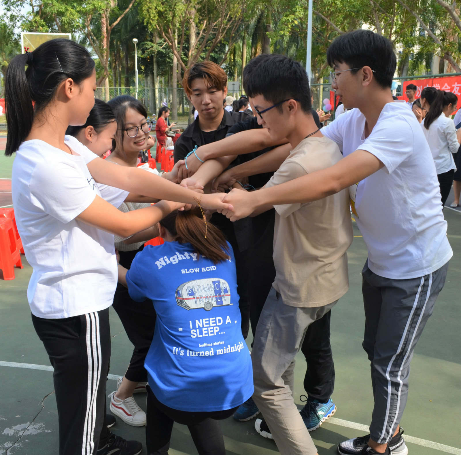 早上六点三十分,工作人员提前到达进行场地布置、组织签到、分组等工作。活动开始,现场同学按照颜色被分为五个小组,主持人介绍了活动流程以及活动内容,随后按照“解手链”“说东道西”“报纸叠加”“瞎子指挥瘸子”“正话反说”五个团体游戏有序进行,旨在考验同学们的协作能力,培养团体精神。