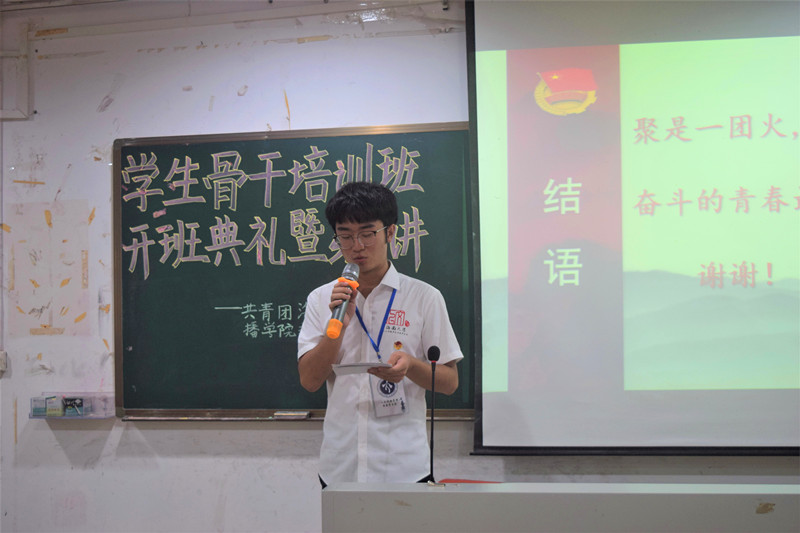 开班典礼在庄严的国歌声中拉开帷幕,熊文军老师在开班典礼上致辞,他以本期团校培训主题——“青春作伴好学习,团团和你在一起”——鼓励学员铭记学生干部们为大家服务的初心,并不断加强学习,实行自我完善,努力成为一个更优秀的人。随后团委组织部干事宋诗怡为学员宣读了团校章程和学员最终成绩评定方法。2018级学生张博蔚代表学院学员发言,表示作为一名学生干部应该兼顾好自己的学习和工作,努力散发自己的光和热,更好地服务同学。开班典礼在全体学员合唱中国共产主义青年团团歌《光荣啊,中国共青团》中圆满落幕。