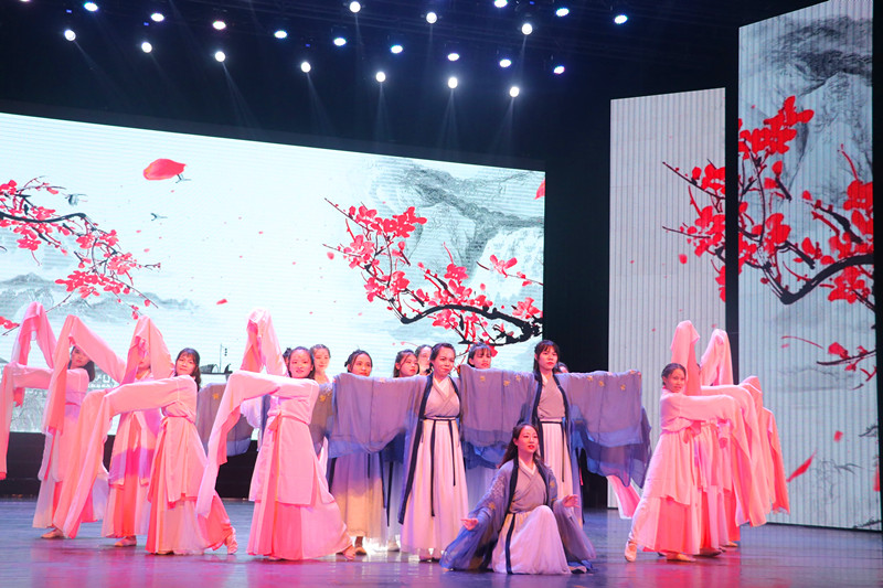 在第三篇章“解忧云水谣”中, 17级中文四班的同学们身着汉服带来群舞《破晓》,舞者们尽态极妍,舞出人文院的厚重底蕴;笑声工作坊带来的喜剧《因为你是女侠》,幽默的剧情与演员们极具感染力的表演让观众们捧腹大笑,深刻的主题又让观众们在笑后有所思考。备受期待的走秀《青芷芳华》创新性地加入汉服元素,精彩的走秀表演,惊艳四座,尖叫欢呼声此起彼伏;晚会尾声,由团学青成员们带来舞蹈《飞过时间的海》,欢快的歌声,整齐的舞步,彰显了团学青强大的凝聚力,会场的氛围被推向高峰,在不绝的欢呼声与掌声中,人文传播学院“南渡·少年游”迎新文艺晚会圆满落幕。