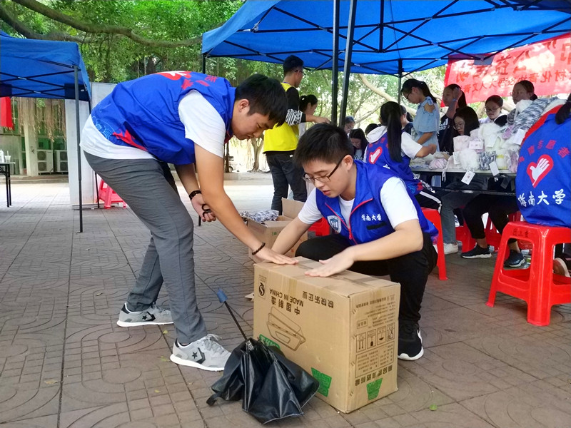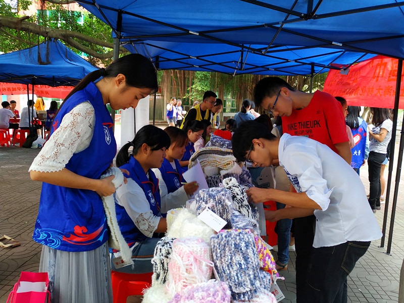 2018年12月1日下午,在海南大学城西校区大榕树下,由人文传播学院青年志愿者协会和材料与化工学院青年志愿者协会联合举办的“爱心围巾”公益活动正在进行围巾回收工作,来自两个学院的13名志愿者各负其责,活动顺利进行。