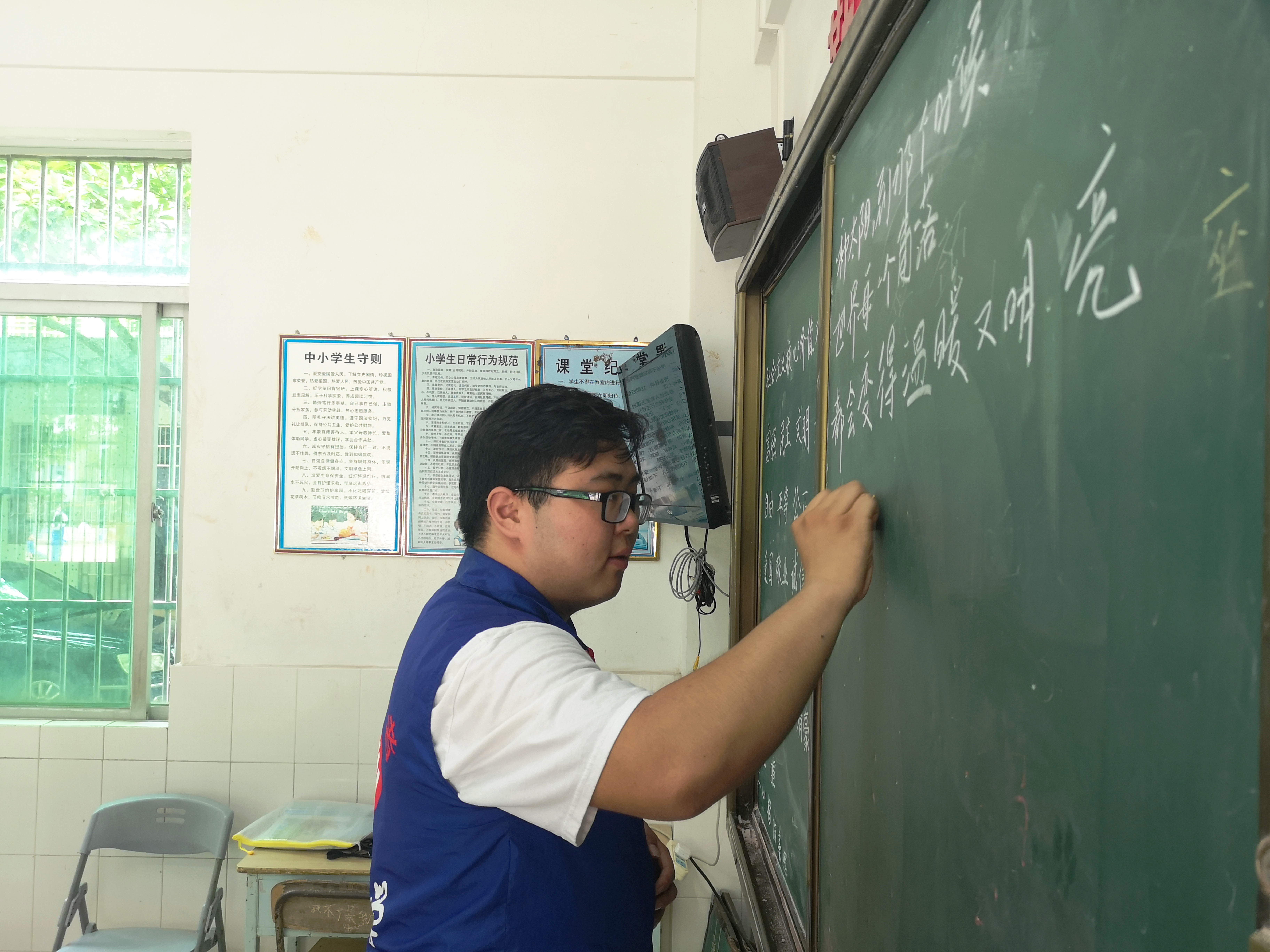 此次活动的主要课堂任务是教孩子们学习歌伴舞《种太阳》,为六一儿童节特别活动排练节目。趁着课间休息时间,志愿者将《种太阳》的歌词写在黑板上,并细心地用拼音将生字标注出来。