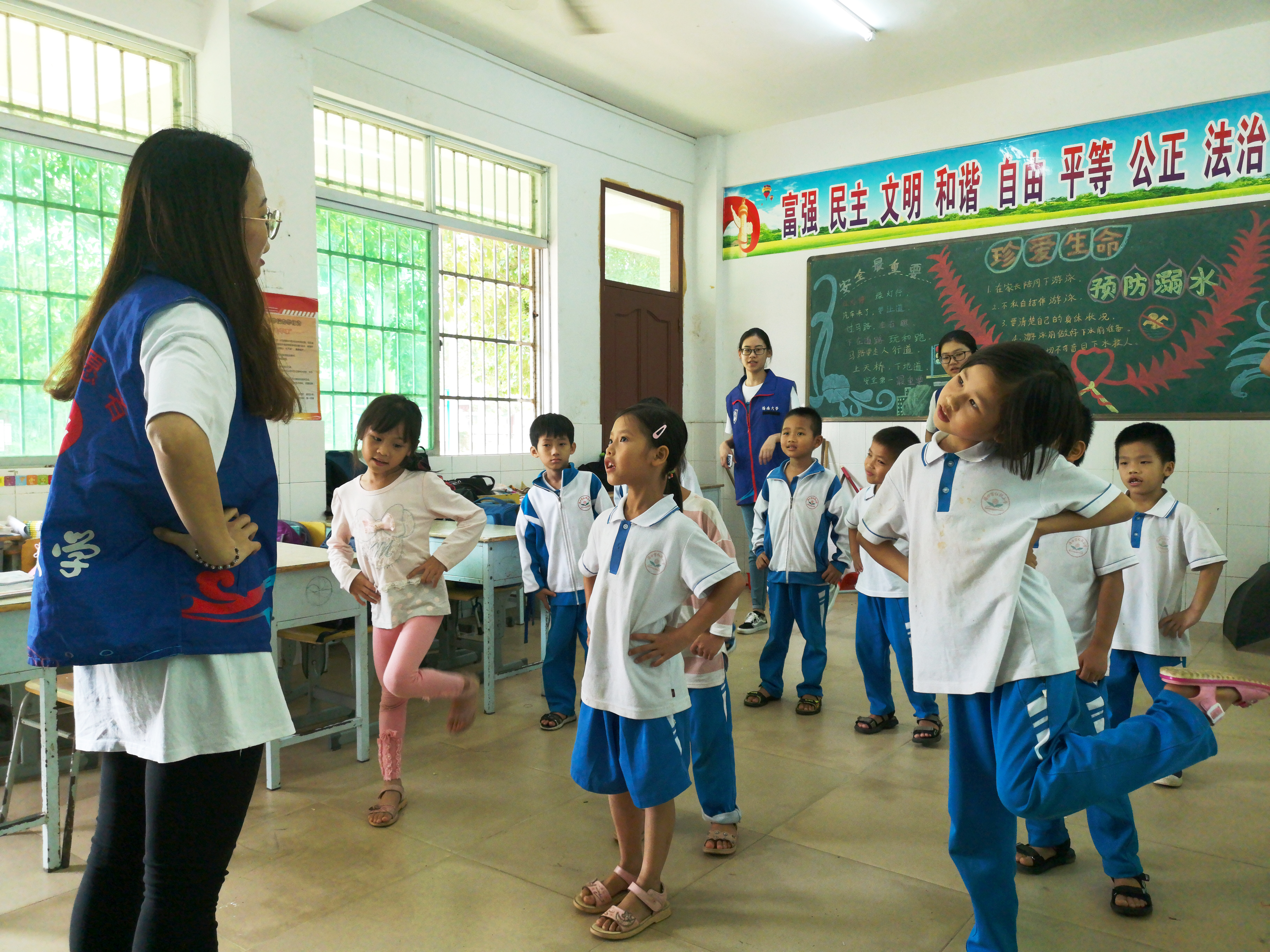 上课铃声响起,志愿者走上讲台,维持课堂秩序,开始对今天的教学内容进行讲解。传达完当日的课堂任务后,志愿者开始进行舞蹈教学,耐心示范舞蹈动作,孩子们积极地与志愿者互动,认真模仿舞步。记牢舞蹈动作后,孩子们与志愿者伴着《种太阳》的乐曲一起跳舞,课堂气氛十分活跃,本次活动在孩子们歌声和舞蹈中达到高潮。节目排练结束后,志愿者在教室内辅导孩子完成课后作业,对孩子们提出的难题进行讲解,并帮助他们纠错、改正。