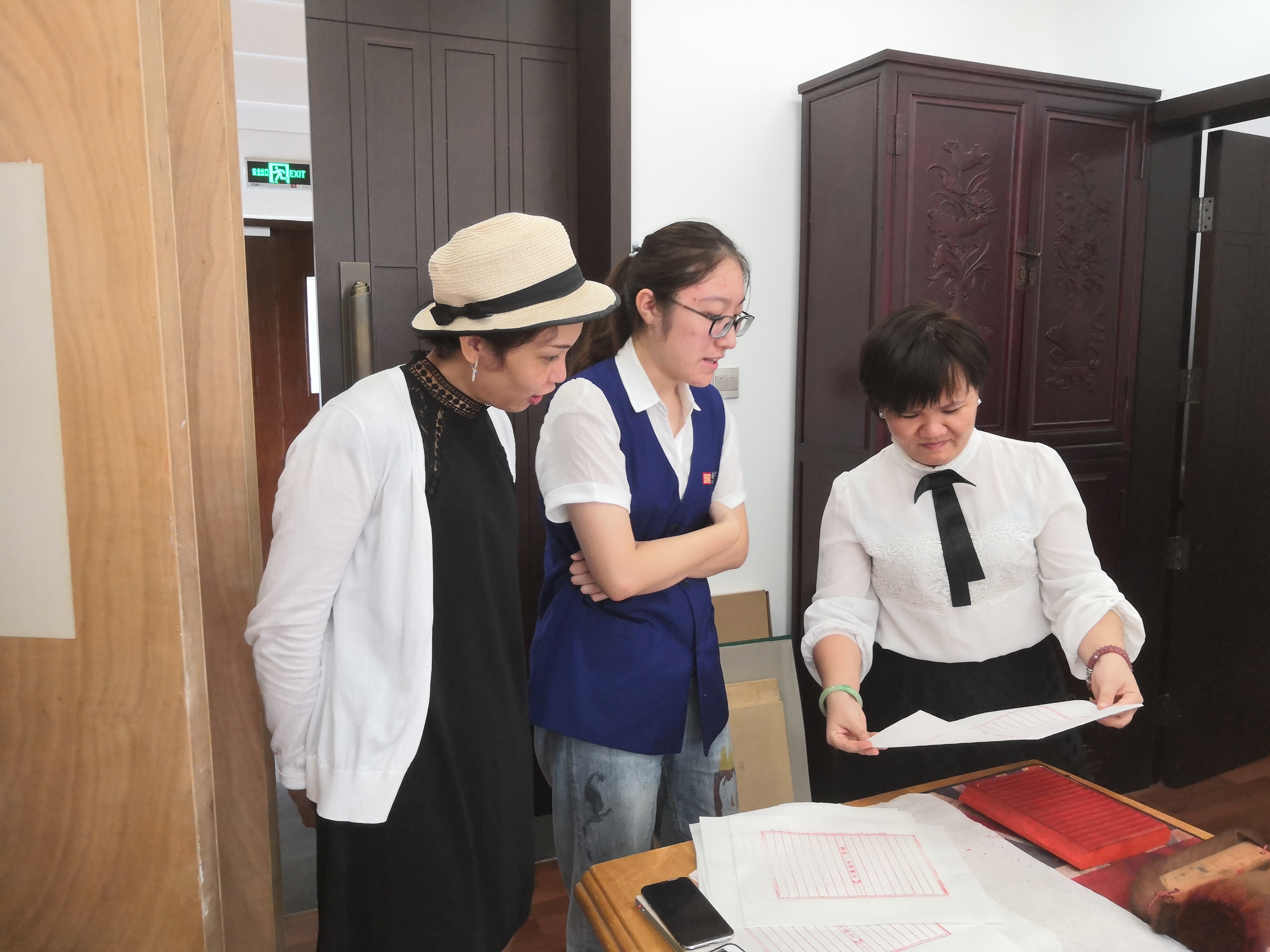 暖风微醺,书香满溢。在书香弥漫的省古籍保护中心,志愿者们开始了当天的志愿服务工作。在古籍修复专家的讲解下,志愿者们对拓印技术的历史和发展有了初步了解。他强调了拓印过程中的注意事项,为志愿者们做示范,志愿者们认真聆听,并亲手练习拓印。先用软布湿润雕版的表面,将红色墨汁均匀地涂抹在雕版上,再铺上一张宣纸,用鬃刷按照雕版的纹理轻刷纸张,一张张拓印作品就这样在志愿者们手中产生了。拓印对涂墨时间、浓度、按压力度和揭起的时间都有严格的要求,但志愿者们始终保持耐心与细心,顺利完成当天的工作。