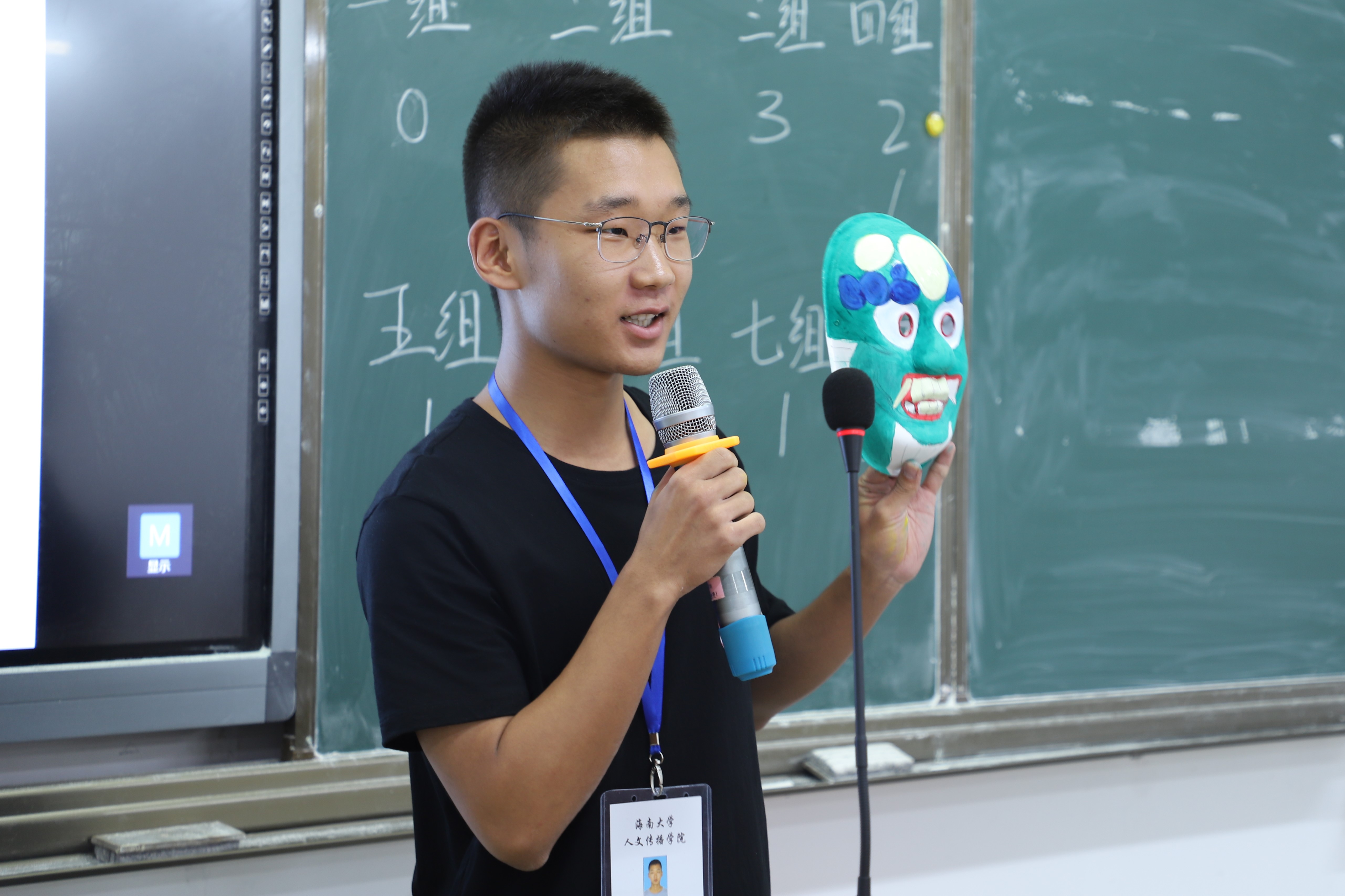 活动伊始,主持人简洁地介绍了本次活动的内容,而后,学院团委学生副书记施雅馨上台致辞。紧接着,学院团委男团倾情献唱,为同学们带来《光阴的故事》以及《水手》,两首歌曲的演唱仿佛将观众们带回到童年,活动现场氛围逐渐升温。精彩的表演过后,活动进入了第一个游戏环节——故事接龙。现场全体同学共分为八组,由每组派出三名代表依次对故事进行续编,同学们脑洞大开。在第一环节的头脑风暴后,同学们来到了经典的“你画我猜”接力游戏,在这个游戏环节中,每组各派出五名代表,第一名同学在看到词条后向后比划,后面的同学依次模仿,直到将信息传递至最后一名同学。面对难度不一的题目,同学们卖力表演,观众们看得津津有味。既是游戏,自然也有胜负,本轮比赛中排名最后两组“光荣地”承担压轴节目表演。随后,本场活动的重头戏——画面具开始进行。同学们拿起画笔,各显神通,笔下的面具有的精致唯美,有的粗旷豪放,有的憨态可掬。面具绘制的最后,各组同学们纷纷推选出自己心里的最美面具上台分享面具的设计理念,最后由评委们评选前三名送出精美礼品。活动接近尾声,也到了揭晓游戏环节中的精彩惩罚的时刻——由各学生组织的男负责人们组成的人文传播学院男团“C位”出道,一曲《野狼disco》嗨翻全场,活动又一次被推上高潮。