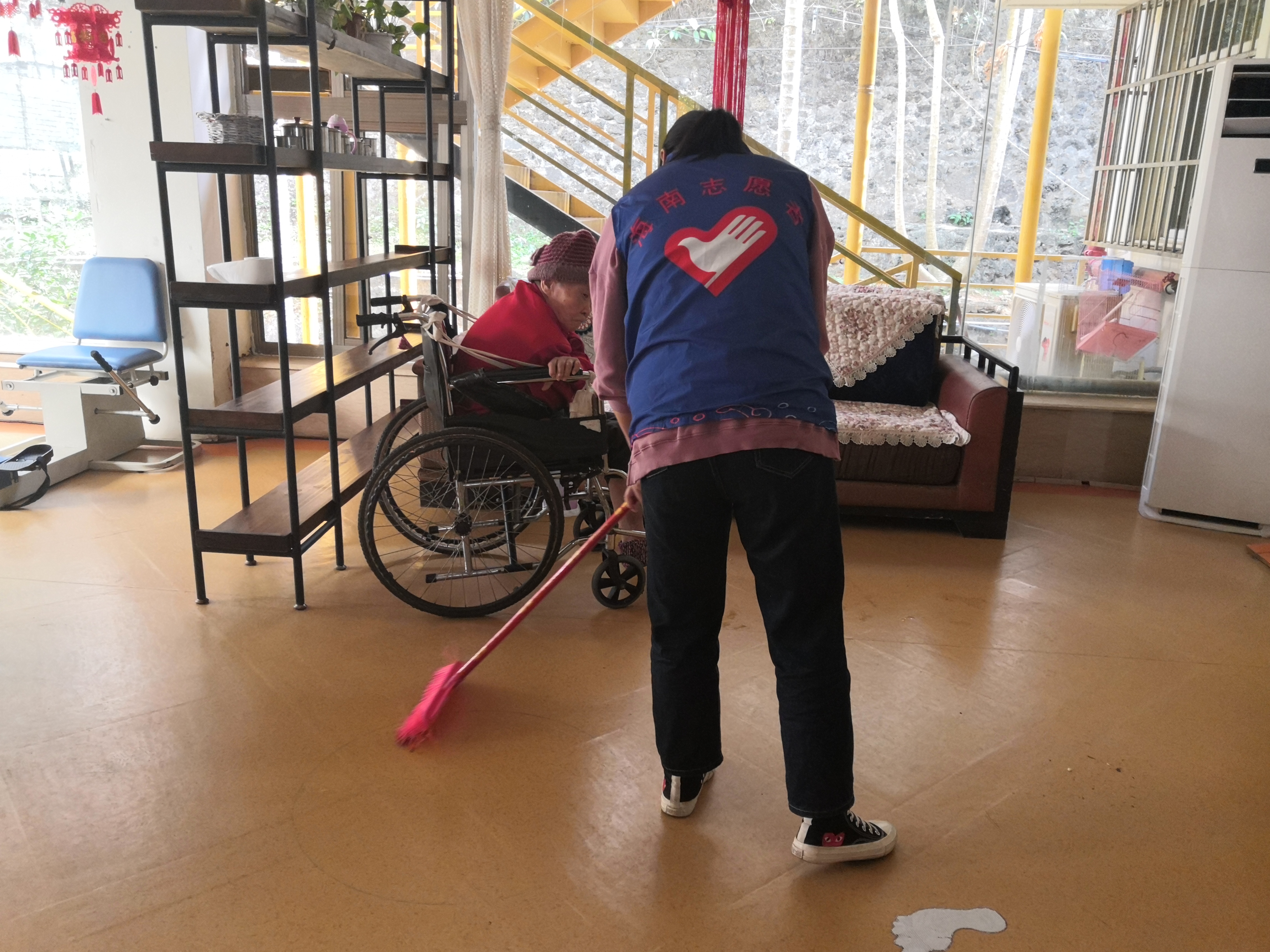 当日下午,志愿者们于海甸校区北门集合,随后一同前往活动地点。志愿者到达老年公寓后,自由分成三组,前往三个楼层进行志愿活动。再次看到熟悉的面容,志愿者与老人亲切问候,为老人捶背按摩,整理衣物和床褥。近来天气转凉,但阳光依旧明媚,志愿者推着轮椅,带老人到屋外晒太阳、散步。志愿者与老人亲切交谈,老人兴致盎然地向志愿者们分享近日的生活。交谈甚欢之余,志愿者询问老人是否口渴,并热心喂老人喝水。虽然这一过程并不熟练,但志愿者努力尝试,得到了老人的称赞。同时,志愿者帮助护工打扫房间,擦洗门栏,给老年公寓做了一次大扫除,希望能为老人提供更好的居住环境。