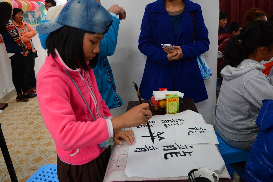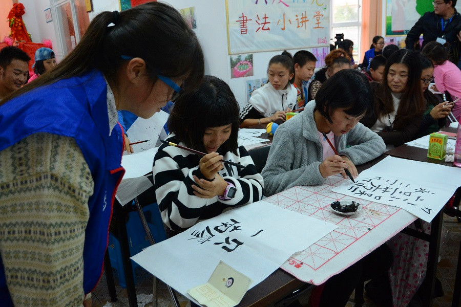 志愿者和孩子们一起学习书法