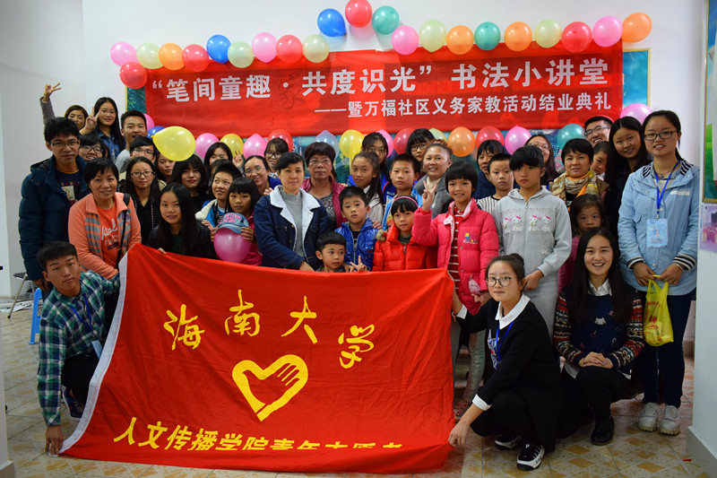 2016年11月6日,为进一步丰富万福社区孩子们的课余生活、增进亲子间的沟通,培养孩子对优秀传统文化的传承意识,海南大学人文传播学院青年志愿者协会联合海南大学书法协会、美兰区万福社区举办了“笔间童趣.共度识光”书法小课堂活动。此次活动有幸邀请到了美兰区人民街道团支部副书记王敏敏、万福社区团支部书记徐佳龙、万福社区志愿服务站站长毛小姬。本次活动作为本学期万福社区义务家教的结业典礼,为该活动画上了一个圆满的句号。