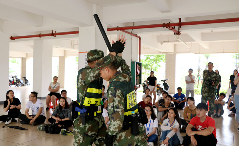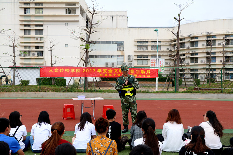 为了进一步加强全体师生的防恐、防暴安全意识,提高师生对突发事件的应变、逃生、自救、自我保护的能力,2017年3月25日下午,海南大学人文传播学院于海南大学海甸校区第二田径场举办防暴恐安全知识讲座。活动邀请了武警海南省边防总队训练基地的文教官和他的三名同事担任讲师。团委书记熊文军老师和学工办李润东老师应邀参加了本次活动。 下午3点,防暴恐安全知识讲座正式开始。首先,文教官以新疆暴恐事件引起的再测失踪人口数量庞大为切入点,向大家说明了暴恐事件的巨大危害和增强防暴恐意识的重要性。接着,他又以英国中心议会大厦暴恐事件和天安门金水桥暴恐事件为例,向同学们介绍了暴恐事件的基本形式并分析了暴恐分子作案时的心理状态和基本手法。随后,各位教官利用塑料棒,矿泉水瓶等道具为大家亲自展示了近身缠斗等自我保护的措施。文教官表示,当暴恐来临时,同学们应当牢记“跑,躲,反抗”这三要素,同学们由于自身体力不如歹徒,应当以“跑”和“躲”为主,尽可能避免和歹徒的正面接触。在教官演示期间,同学们认真聆听教官的讲解并积极学习相关反抗动作。最后,文教官为大家总结了关于校园防恐防暴的要点,期望通过今天的讲解,同学们的防暴恐意识可以有所提高。 本次防暴恐安全知识讲座,不仅使同学们对反恐防暴的重要性有了更深层次的理解,还提高了同学们的防暴恐安全意识和自我保护的能力,也对做好校园防暴恐突发事件的应急反应工作给予了很大的帮助。