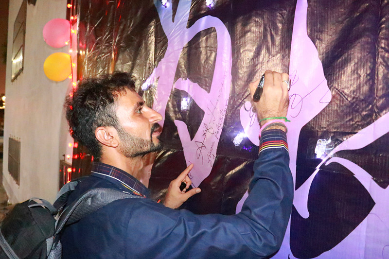 在确认道路安全后,夜跑队伍从海南大学海甸校区第二田径场开始向东出发。每经过一个路口,便有志愿者拉起警示带,为同学们开辟一条安全通道,保障队伍顺利通行。在绕行一圈后,队伍有序回到起点,志愿者们挥舞着院旗迎接队伍的归来。此外,在活动中,队伍中加入了几位被本次万圣节人文荧光夜跑活动所吸引的外国友人。队伍顺利抵达本次夜跑活动终点后,闭幕仪式开始进行,主持人邀请嘉宾于幕布处签名并合影留念,并特别邀请外国友人一同签名见证,最后,本次活动的全体参跑者及志愿者上台签名。至此,本次活动圆满落幕,全体参与者组织大合影。
