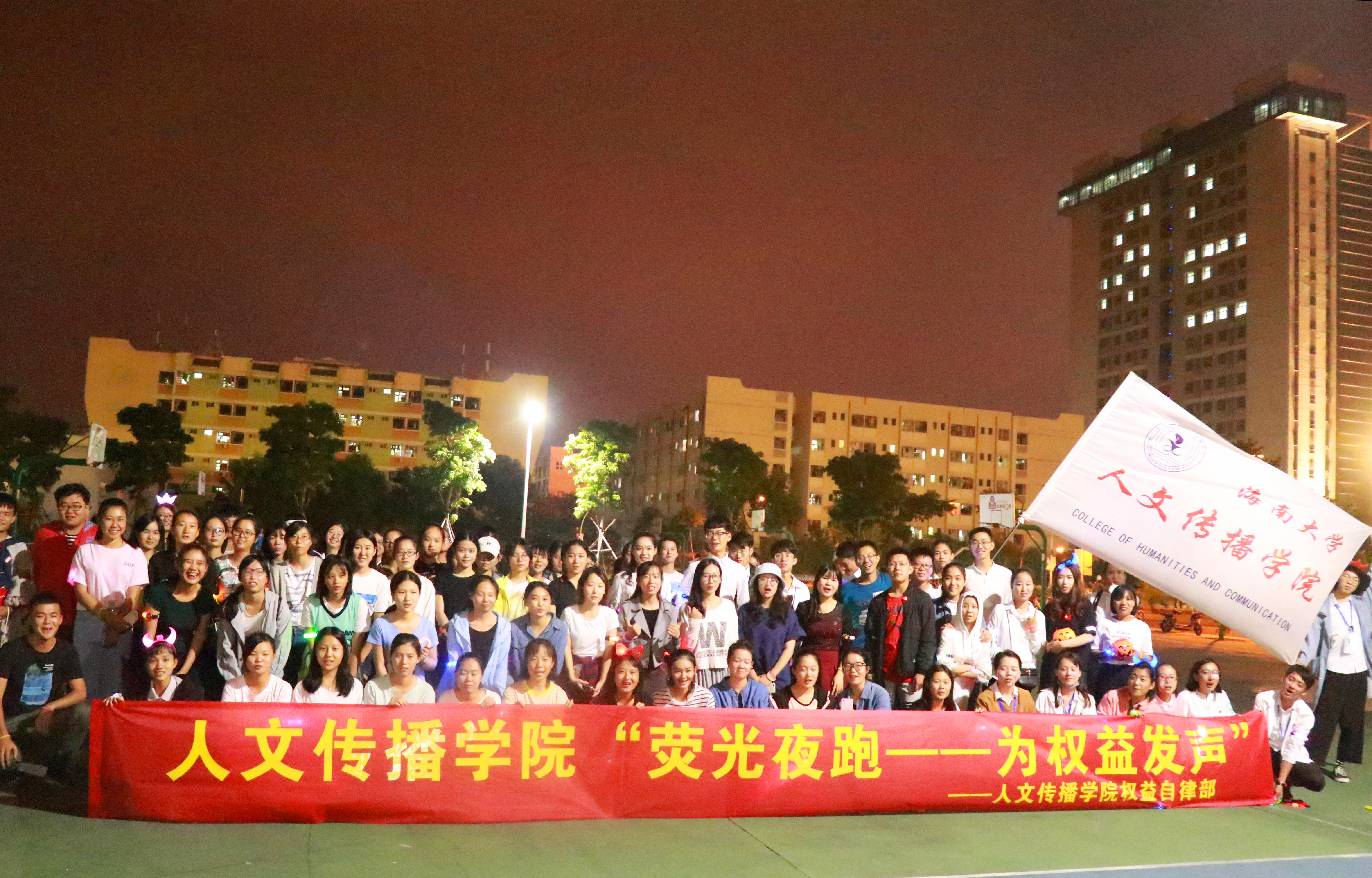 10月31日晚19:30,海南大学人文传播学院权益自律部主办的“为权益发声”荧光夜跑活动在海甸校区第二田径场附近篮球场激情开场。本次活动到场嘉宾有人文传播学院团委副书记王安祺,学生会主席魏有美,学生会副主席黄梅梅、马鑫、王峣,青协会长张之越,以及特邀嘉宾海洋学院学生会主席何心灵,材料与化工学院学生会主席路苪杰,土木建筑与工程学院学生会主席谢攀。