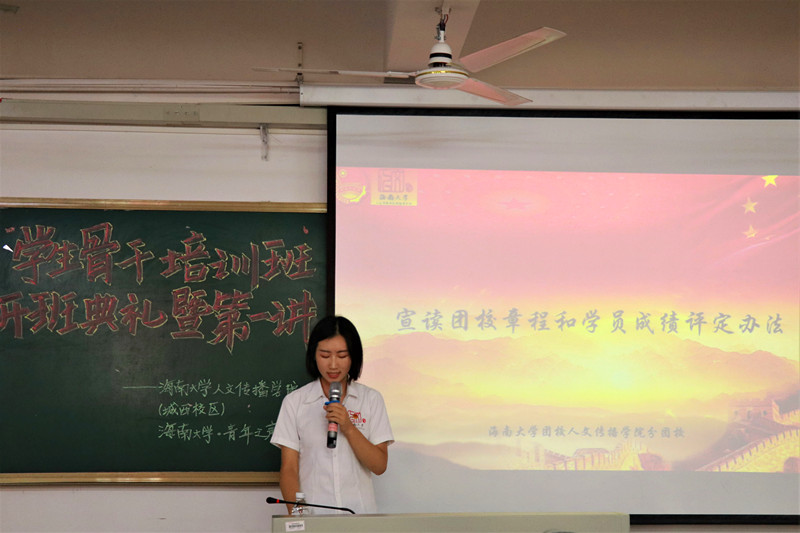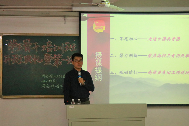 开班典礼结束后,熊文军老师给大家带来了本期骨干培训的第一讲。熊老师从三个方面与学员展开交流:第一,不忘初心——走近中国共青团。他从共青团光辉历史与发展历程出发,阐述党与团的关系及共青团在新时代的意义和责任。第二,聚力创新——聚焦高校共青团改革。熊老师围绕高校共青团改革中的“四维工作格局”、“去四化,强三性”、“1+100制度”、“智慧团建设”、“班团一体化建设”等改革要点进行讲解,并带学员系统学习了刚刚出台的《海南大学共青团改革实施方案》。第三,砥砺前行——高校共青团重要工作模块交流。熊老师结合学院工作案例围绕青年志愿服务工作、大中专学生“暑期三下乡”暑期社会实践活动、“挑战杯”全国大学生课外学术科技作品竞赛及“创青春”全国大学生创业大赛、教育部“互联网+”创新创业大赛、智慧团建——网上共青团建设、基层活力团支部建设等六大模块与学员进行深入交流。
