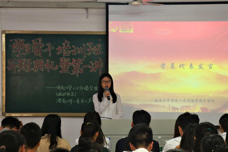开班典礼在庄严的国歌声中拉开帷幕,熊文军老师在开班典礼上致辞, 他以本期团校培训主题——“不忘初心跟党走,青春建功新时代”——鼓励学员铭记学生干部为大家服务的初心,不断加强学习,努力成为一个更优秀的人。2017级学生高闻代表学员发言,她认为学生干部作为优秀学生代表,应严于律己以身作则,树立典范及起到带头模范作用。主持人王安祺为学员宣读团校章程和团校学员成绩评定办法。开班典礼在全体学员合唱中国共产主义青年团团歌《光荣啊,中国共青团》中圆满落幕。