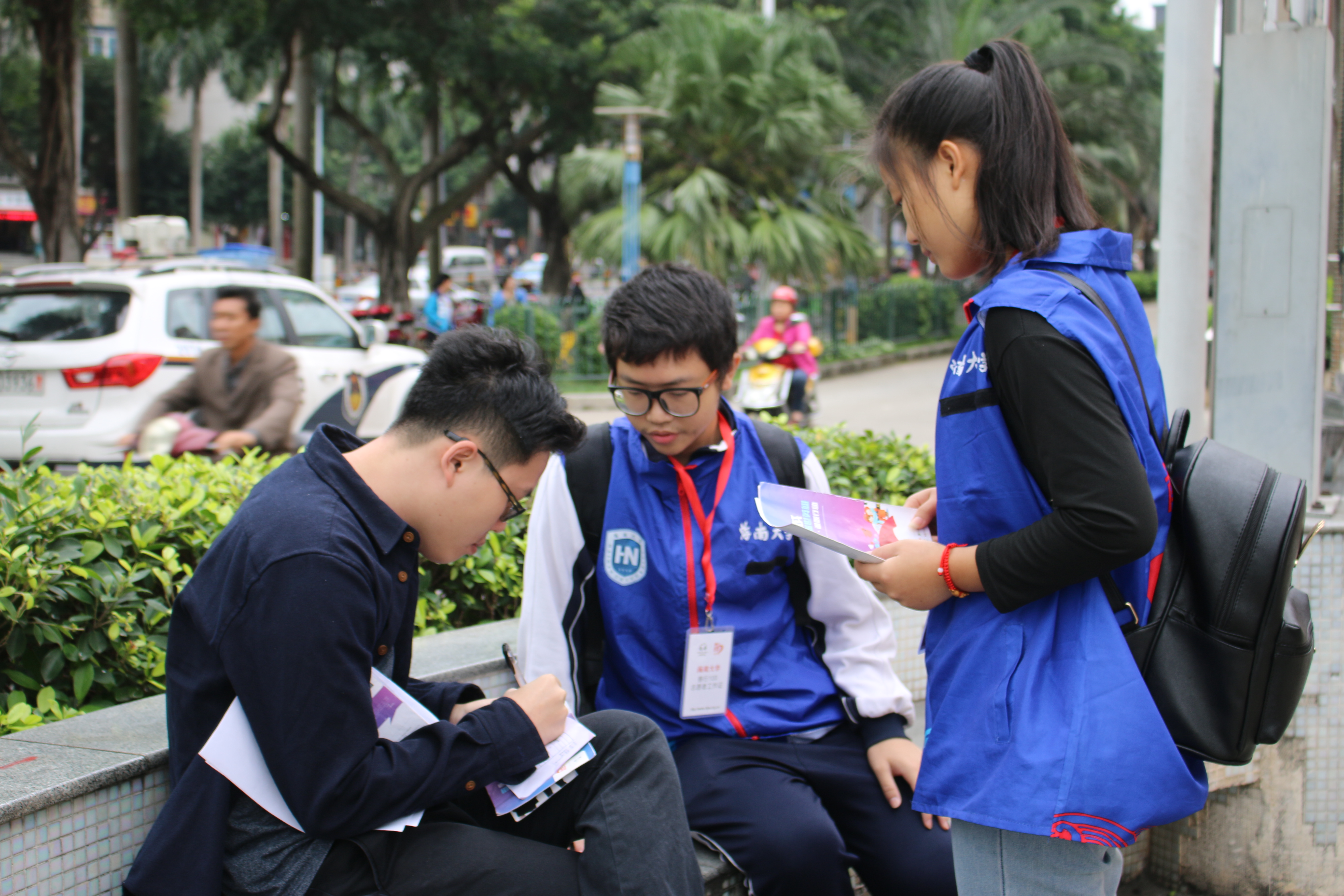 早上七点三十分,志愿者们准时在海南大学(城西校区)集合并签到,一同乘坐公交车前往海秀中路邮政营业厅。到达目的地后,由青协工作人员为志愿者们详细的讲解了劝募的具体流程和活动注意事项,为他们分发了带有二维码的工作证、活动宣传单、以及劝募成功后需要填写的三联单等物品。之后,志愿者们两人一组,前往附近的街道开展劝募活动。他们耐心地向每一位过往的路人介绍本次活动的内容及意义,并号召大家进行募捐。尽管在劝募过程中,志愿者们被拒绝、被质疑,但这并没有磨灭志愿者们的初心与信念。在海口市的街头巷尾,我们依然能看到志愿者们的小小身影。期间,有位志愿者在经历多次拒绝后,终于劝募成功,她表示:“真没想到我今天能成功,看到叔叔扫码支付100元的善款时,我超级激动,比抽中奖还幸运,对于这样的好心人,除了感谢还是感谢……”在这场为爱的大作战中,志愿者们用最切实的行动与最真挚的感情默默付出着。中午,在志愿者们的齐心协力和社会爱心人士的无私奉献下,劝募活动圆满完成。