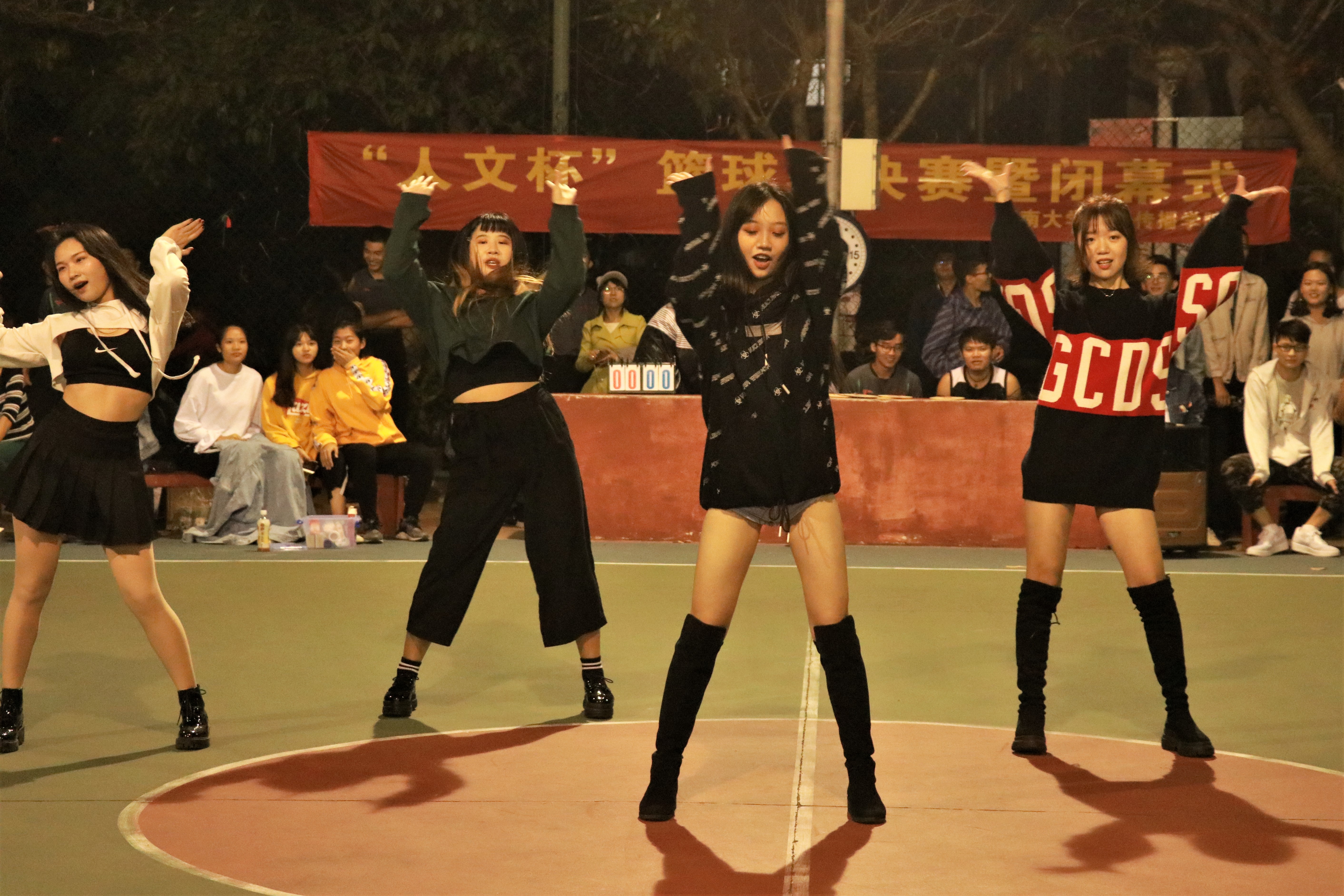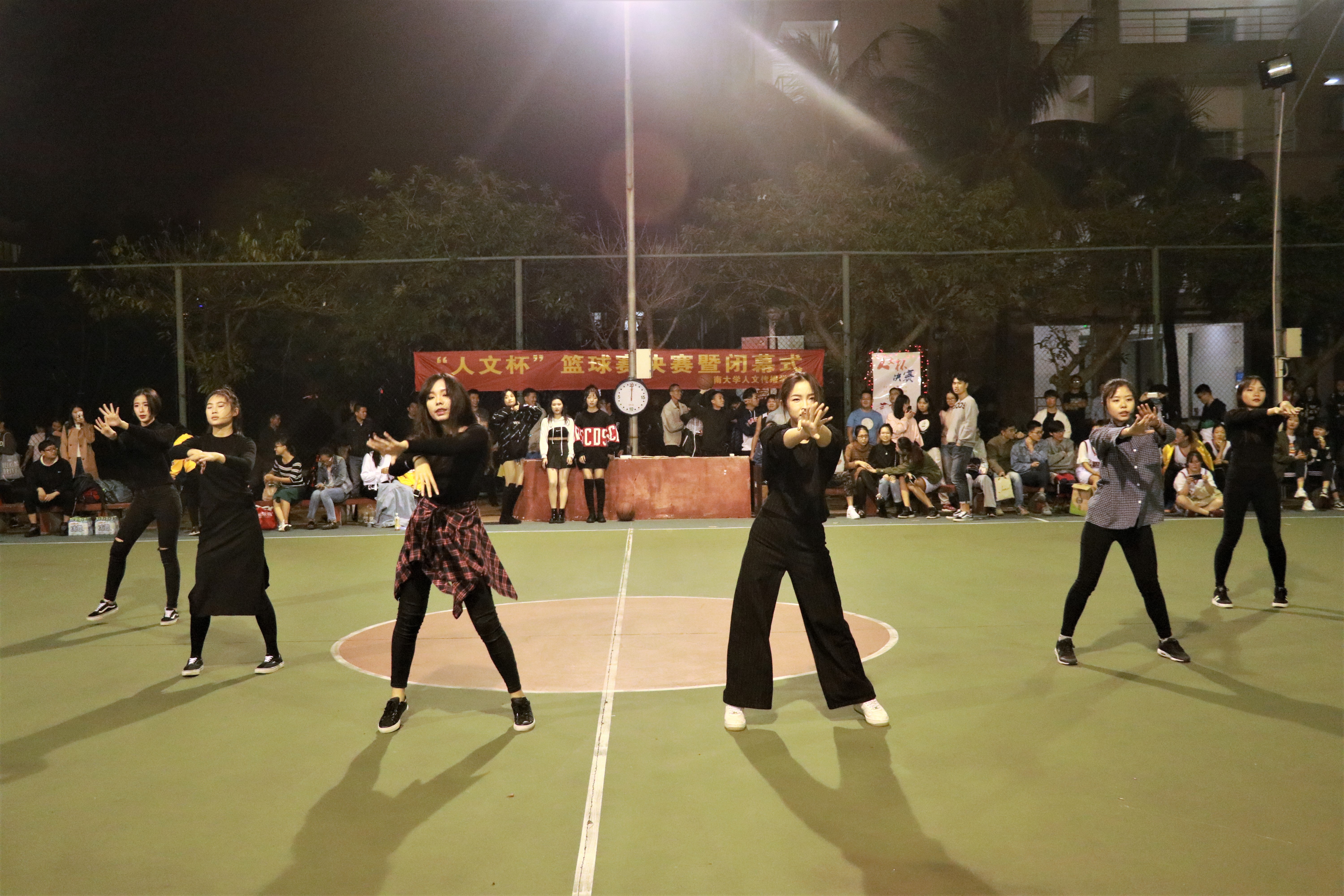 伴随着音乐响起,文工团为我们带来开场热舞《boombayah》,瞬间炒热了现场的气氛。热舞过后,女篮率先开场,双方有序进场。在裁判开球后,激烈的角逐随之开始,双方队员都拼尽全力,展示了其高超的球技,14汉教队凭借丰富的经验在开始时便保持着领先优势,最终以24比10的成绩获胜,夺得本次比赛女篮组冠军。