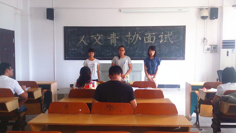 2014年10月14日,海南大学人文传播学院青年志愿者协会在海南大学城西校区开展了协会干事的招新活动,并于10月19日顺利完成后续的面试工作。 10月19日上午招新面试工作有序展开,面试现场气氛热烈,参加面试的同学积极展现自己,表现出新时期当代青年学生的良好面貌。此次招新吸引了来自全院各系的70多位同学报名,可见同学们对青协热情之高,人文情怀之浓,乐于助人关爱社会的心也是诚挚至极,让人感动。现场由院社会实践部干事负责安排面试人员签到及进场面试,现任青年志愿者协会主要干部担任面试主考官,面试内容根据青协各部门职责和工作性质展开。 人文传播学院青年志愿者协会是广大人文青年学生从事志愿服务、社会公益服务活动的学生组织,是所有人文志愿者服务他人、贡献社会、参与志愿活动、实现自我价值的平台。2014级新生积极参与此次招新活动,充分展现出当代大学生贡献社会的服务精神,展现了新时代大学生良好的社会风貌。 人文青年协供稿