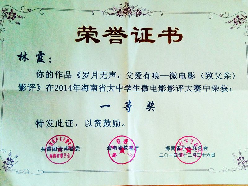 2014年底,在由共青团海南省委、海南省教育厅、海南省学生联合会开展的“汲取青春正能量,践行社会主义核心价值观”2014年海南省大中学生微电影观看暨影评大赛中,lol下注