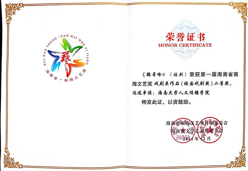 学生社团海棠剧社选送的话剧作品《鹦哥岭》荣获第一届海南省南海文艺奖戏剧类作品(校园戏剧奖)二等奖。海棠剧社再次为我校争得荣誉。