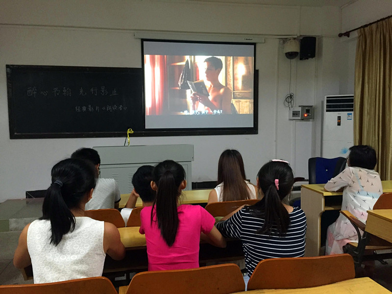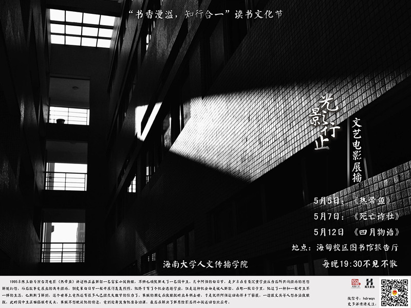 2015年5月.人文传播学院“书香漫溢.知行合一”读书文化节之“醉心书翰.光行影止”文艺电影展映活动分别在海南大学城西校区和海甸校区海南大学读书馆多功能厅成功举办。本月共放映文艺电影四部,《热带鱼》、《死亡诗社》、《四月物语》、《朗读者》经典影片吸引了众多同学的参与。