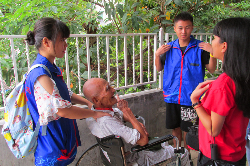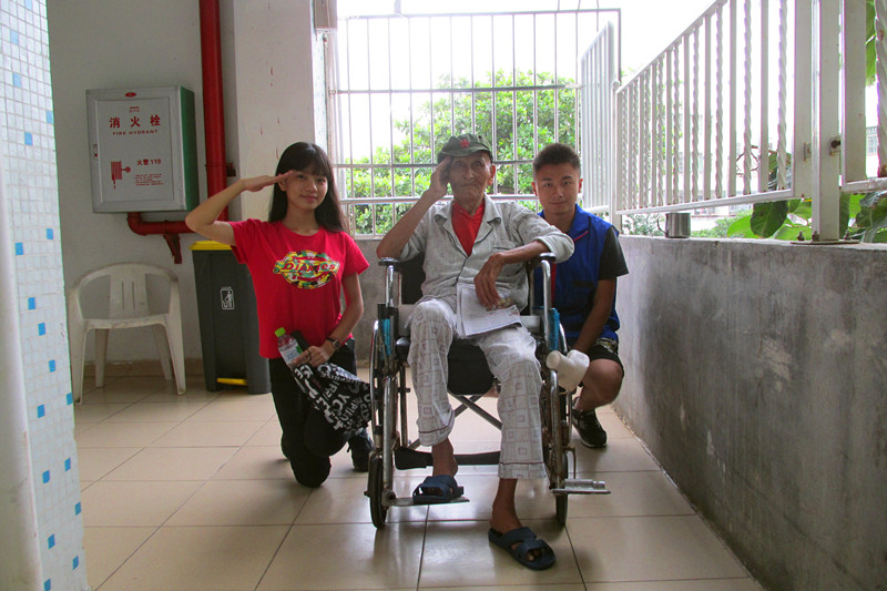 清早便下着淅沥沥的雨,让人感觉到些许凉意,但丝毫没有影响志愿者们向老年公寓前进的步伐。八点四十分左右,志愿者们顺利抵达老年公寓。志愿者与老人们渐渐熟络后开始给老人们按摩、读报,同老人聊天,为老人表演才艺……公寓里很快热闹起来。在其乐融融的氛围中,一位爷爷引起了大家的注意。爷爷头顶的那顶红星军帽成了公寓里一道亮丽的风景线,这也让我们知道爷爷是个有故事的人。而后,爷爷充满激情地给志愿者讲起了当年的革命故事。最让我们动容的是爷爷对肩章的呵护,他把肩章用打了结的黑色袜子和塑料袋包着,稳稳的放在胸口前的口袋里,当爷爷小心翼翼地掏出给大家看时,我们看到了一位革命老兵珍贵的记忆。当志愿者提出能否合照时,老人欣然同意,面对镜头,他伸出右手颤颤巍巍地敬礼,饱经沧桑的脸上露出自豪的笑容。每位老人都有自己的故事,而我们是那一群愿意用心去聆听故事的人。