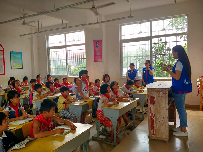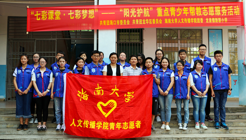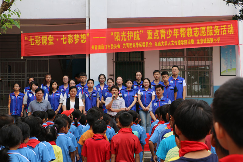 4月12日下午,由人文传播学院联合共青团海口市委员会、共青团龙华区委员会、海口市龙华区新联小学开展的“七彩课堂·七彩梦想”——“阳光护航”重点青少年帮教志愿服务活动在海口市龙华区龙泉镇新联小学启动。共青团龙华区委书记刘尉一丹、龙华区新联小学校长韦长炳,人文传播学院团委熊文军老师及人文传播学院20名大学生志愿者、龙华区新联小学全体师生共同参与活动启动仪式。