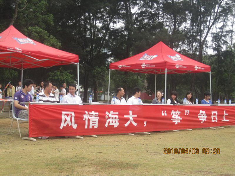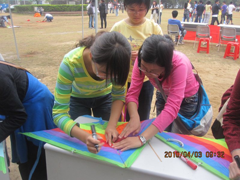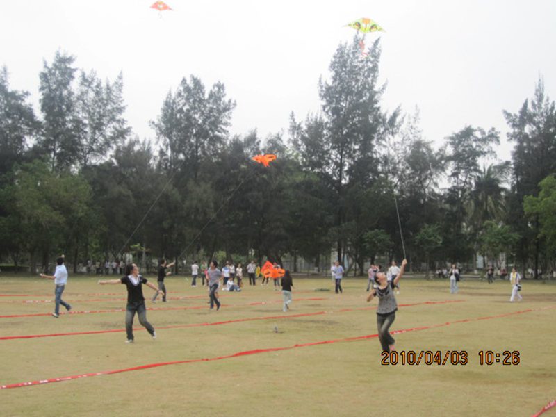 本次风筝文化节由四个部分组成,即征稿比赛、风筝文化宣传、风筝DIY创作比赛和放飞比赛。征稿比赛于4月2日截止;4月3日首先进行的是为时20分钟的风筝DIY创作比赛,15位选手用主办方提供的风筝模板和工具进行个性化创作,他们用灵巧的双手表达自己的创意,忙得不亦乐乎。主持人也在一旁介绍有关风筝的历史和文化,当DIY选手在热火朝天忙着的同时,放飞赛场地也不甘示弱地热闹起来,省风筝协会的胡会长拿出珍藏的大型章鱼充气风筝,为同学们进行放飞展示。娴熟的手法和高高飞起的章鱼让同学们大饱眼福,并勾起了同学们放飞的兴趣。风筝DIY结束后,工作人员把15只风筝挂起由同学们投票。同时,大家期待已久的放飞赛终于开始了。放飞赛分两轮:第一轮为淘汰赛,选手需在3分钟内把风筝放起;第二轮则在六分钟内把风筝放到最高,由评委打分定成绩。第一轮报名的共有9组选手,每组5队,随着一声哨响,选手们高举着风筝奔跑着,借着东风,五彩缤纷的风筝就翱翔在碧空之上,所有人的目光都追逐着它们,让人联想“天上的风筝在天上飞,地上的人儿在地上追”的歌词。放飞赛有序而轻松的进行着,同学们都沉浸在放飞的快乐中。比赛场地外,围观的同学也应和着放起了风筝,一只只老鹰、蝙蝠、美人鱼和燕子盘旋在半空中,和欢呼雀跃的人们构成了一副美不胜收的立体画卷。